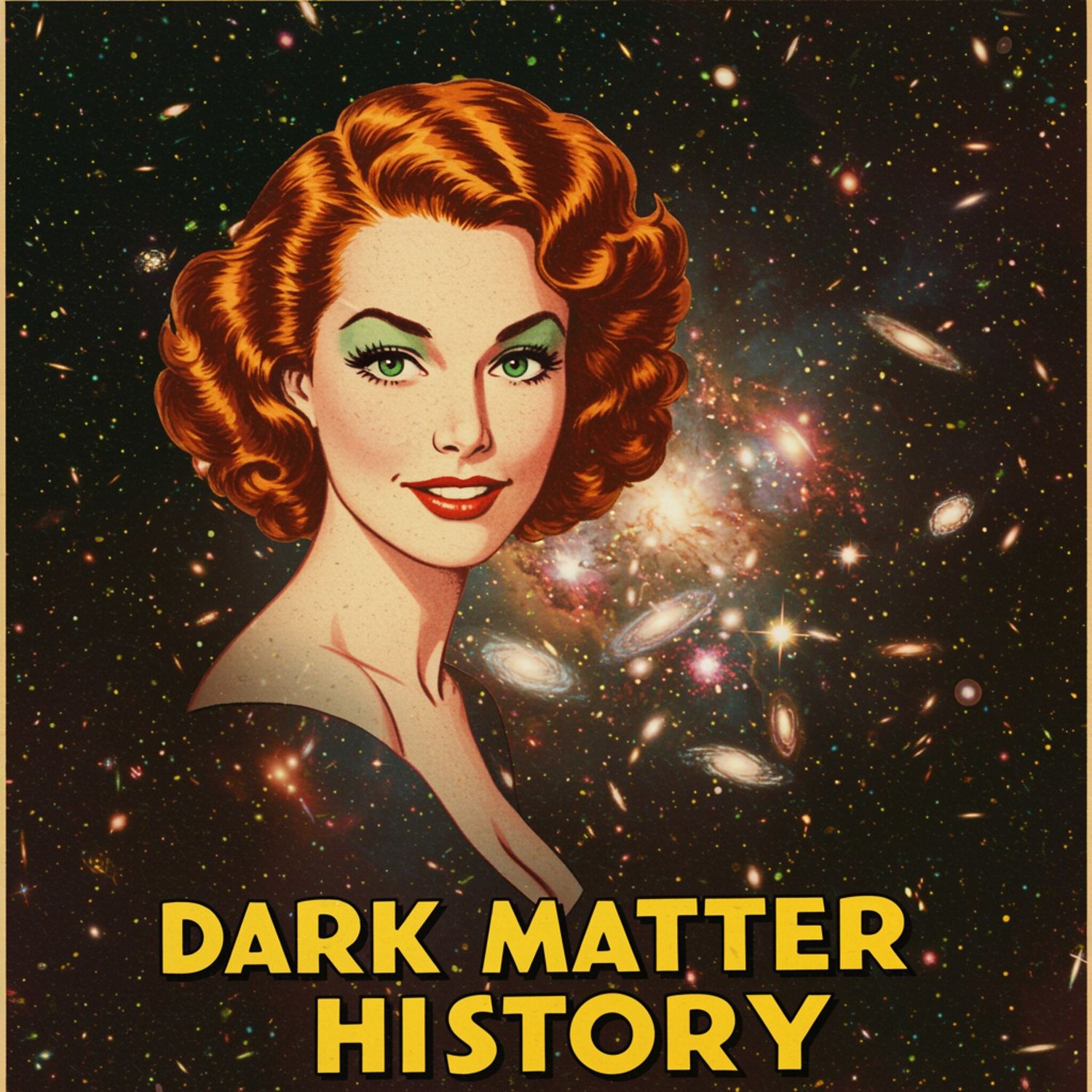 Kobieta prezentuje: of a cluster of galaxies in deep space, with the galaxies arranged in a central, denser area and extending outwards. The background is a dark, starry sky with faint nebulae, enhancing the visibility of the galaxies. The text „Dark Matter History” is prominently displayed in large, yellow comic-style font at the bottom center of the image. The galaxies exhibit a variety of colors and shapes, creating a visually striking yet scientifically accurate depiction. The overall composition emphasizes the gravitational effects of dark matter without any distracting foreground elements or additional text. Background is artistic vision of dark matter.