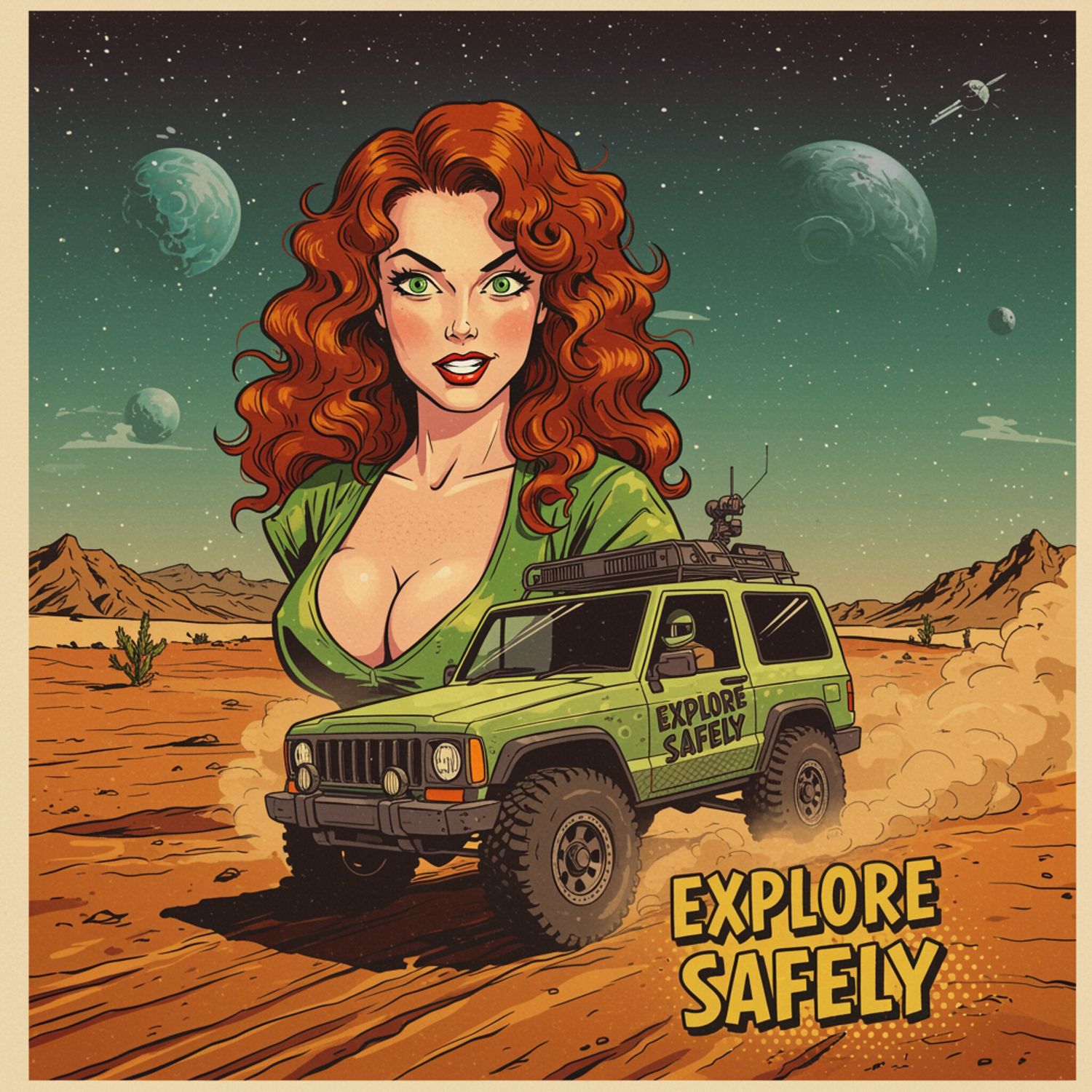 Kobieta prezentuje: of a rugged off-road vehicle, possibly a jeep, navigating through a vast desert landscape during the day. The sky above is clear with several orbiting satellites visible, adding a modern touch to the scene. The vehicle, slightly dusty from the trail, is the central focus, with the desert stretching out behind and around it. The text „Explore Safely” in large, yellow, comic-style font is prominently displayed on the side of the vehicle. The background features distant mountains and sparse desert vegetation, maintaining a focused and realistic composition without unnecessary distractions. The overall mood is adventurous yet safe, emphasizing exploration in a controlled environment. Background is artistic vision of dark matter.