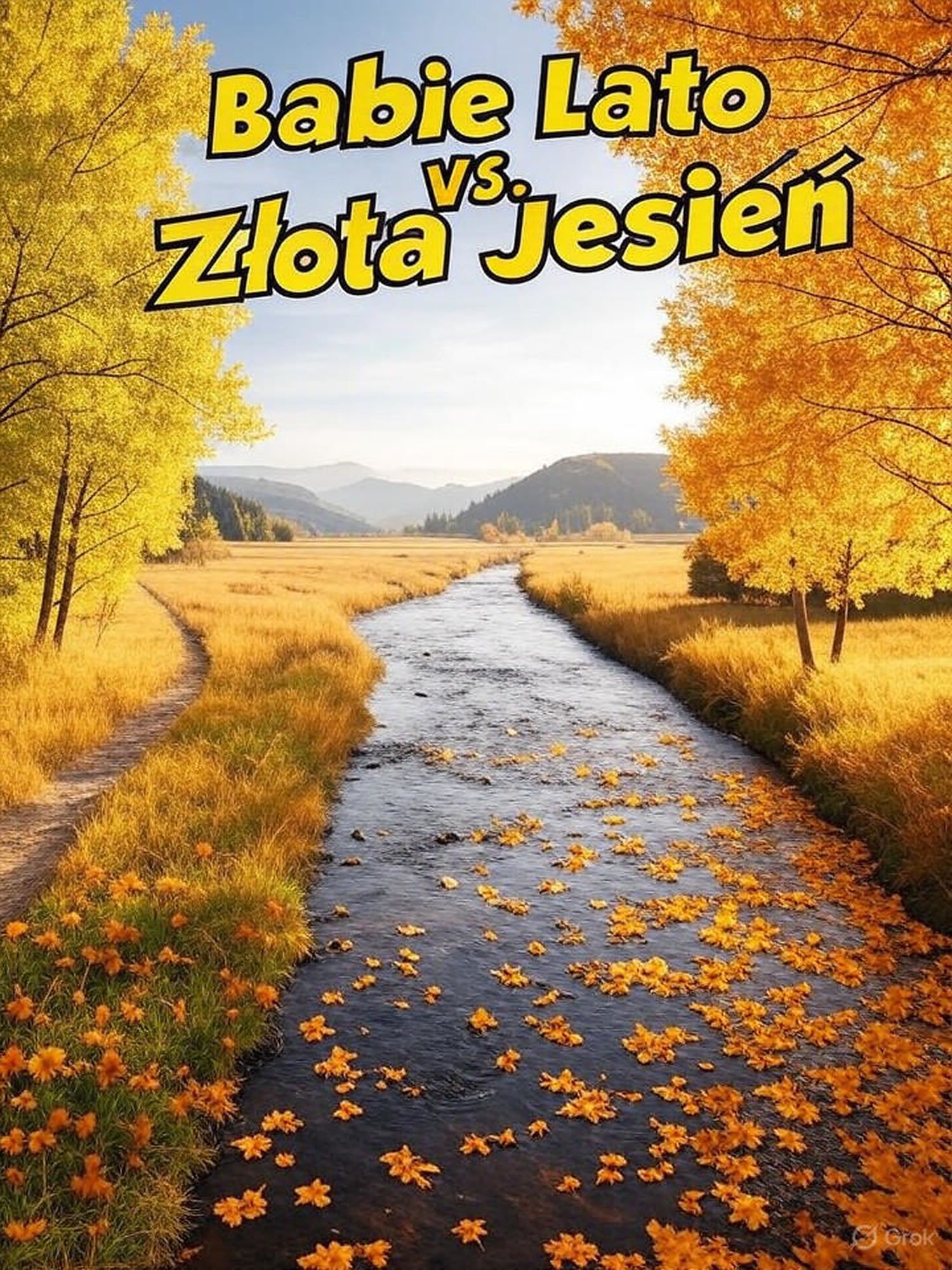 Kobieta prezentuje: of a split landscape contrasting Babie Lato on the left and Złota Jesień on the right, divided by a river. Babie Lato features warm sunny skies, light mists, and vibrant green leaves, while Złota Jesień shows golden autumn leaves, cooler tones, and falling foliage. The text „Babie Lato vs. Złota Jesień” in large yellow comic-style font is prominently displayed at the top of the image. A path runs through both sides, leading from one season to the other, enhancing the transition. The background includes a distant mountain range, maintaining focus on the main landscape. The overall composition is balanced and serene, highlighting the natural beauty of both seasons without any explicit nudity or distracting elements. Background is artistic vision of dark matter.