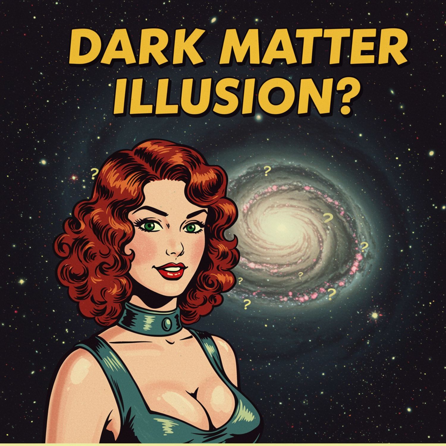 Kobieta prezentuje: of a dark, mysterious galaxy with a swirling, ethereal center featuring subtle question marks or distortions, suggesting an illusion of dark matter. The text „Dark Matter Illusion?” is prominently displayed in large, yellow comic font above the galaxy. The galaxy is set against a deep, starry space background with distant stars and galaxies, enhancing the cosmic theme without distracting from the main subject. The overall composition focuses on the galaxy, with a cool, dark color palette and soft lighting to create a mysterious and contemplative atmosphere. Background is artistic vision of dark matter.