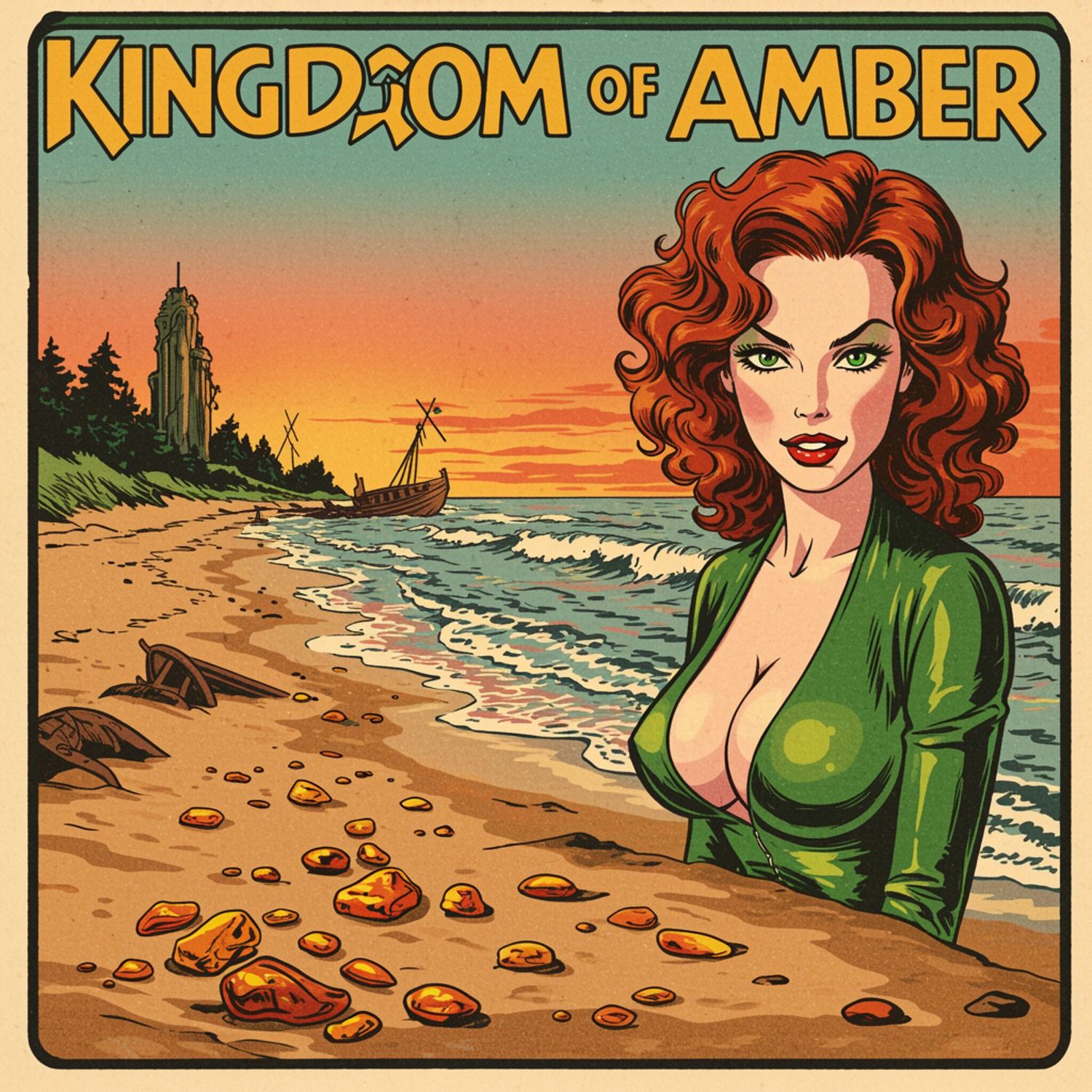 Kobieta prezentuje: of a serene Baltic Sea beach at dawn, with golden amber pieces scattered on the sand. The sky displays a soft gradient of pink, orange, and light blue hues. Gentle waves crash on the shore, and faint outlines of ancient forests and a partially submerged shipwreck are visible in the background. The text „Kingdom of Amber” is prominently displayed in large, yellow, comic-style font at the top of the image. The overall scene is bathed in the warm, soft light of the early morning, creating a tranquil and inviting atmosphere without any explicit nudity or overly dramatic elements. Background is artistic vision of dark matter.