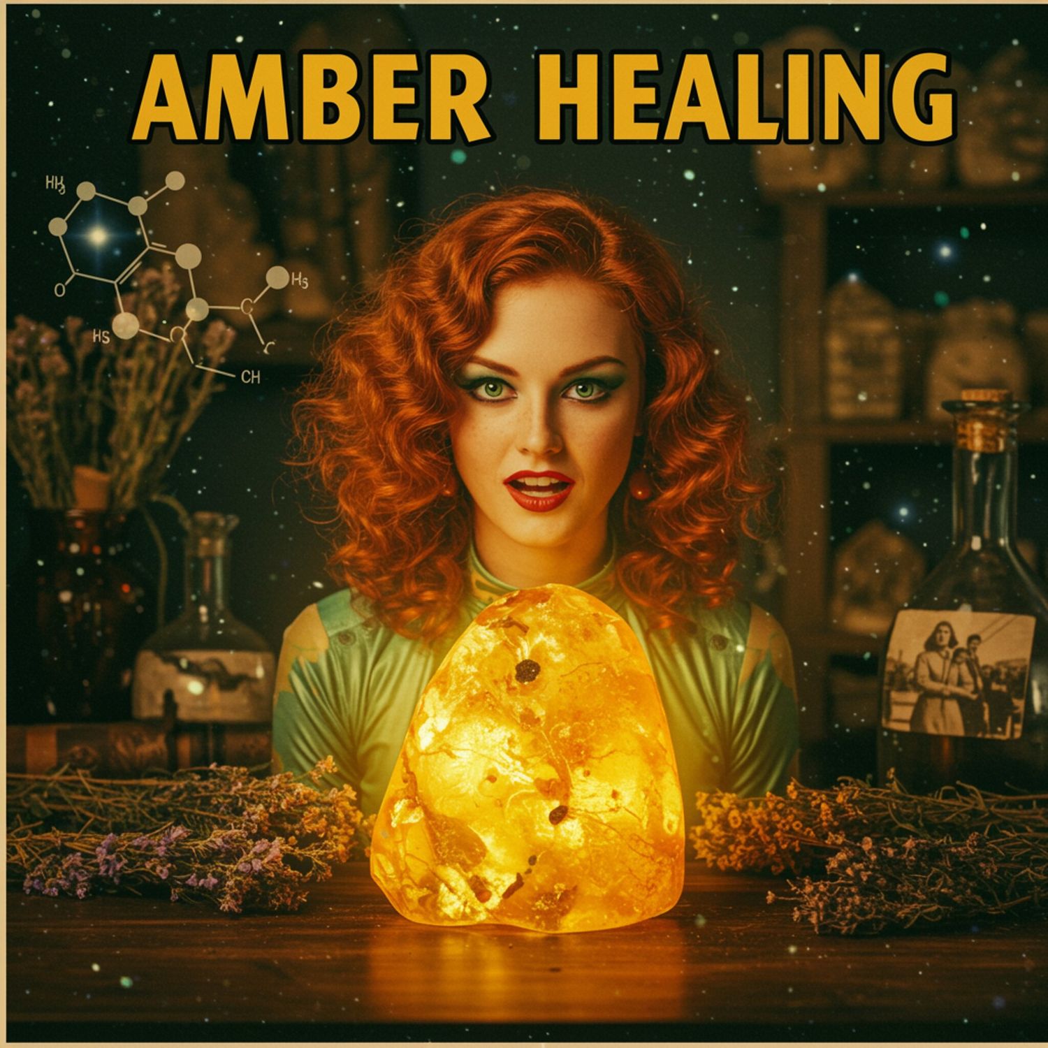 Kobieta prezentuje: of a glowing amber stone embedded in ancient resin, placed on a wooden table in a dimly lit room. The amber is surrounded by various herbs and historical artifacts, with subtle molecular structures overlaid to suggest a scientific aspect. The text „Amber Healing” in large, yellow, comic-style font is prominently displayed at the top of the image. The background features soft, natural lighting and a slightly blurred setting to focus on the amber, creating a mystical yet realistic atmosphere without any explicit nudity or modern distractions. Background is artistic vision of dark matter.