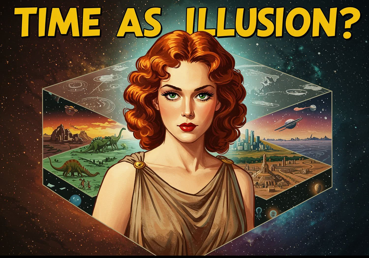 Kobieta prezentuje: A surreal four-dimensional block universe depicted as a glowing crystal cube slicing through layers of past (dinosaurs and ancient ruins), present (a modern cityscape), and future (space colonies and stars), with a thin, shifting 'now’ plane cutting through like a subjective horizon, evoking the illusion of time in philosophy and relativity. The text reads in large, yellow, comic-book style font: 'Time as Illusion?’ Background is artistic vision of dark matter.