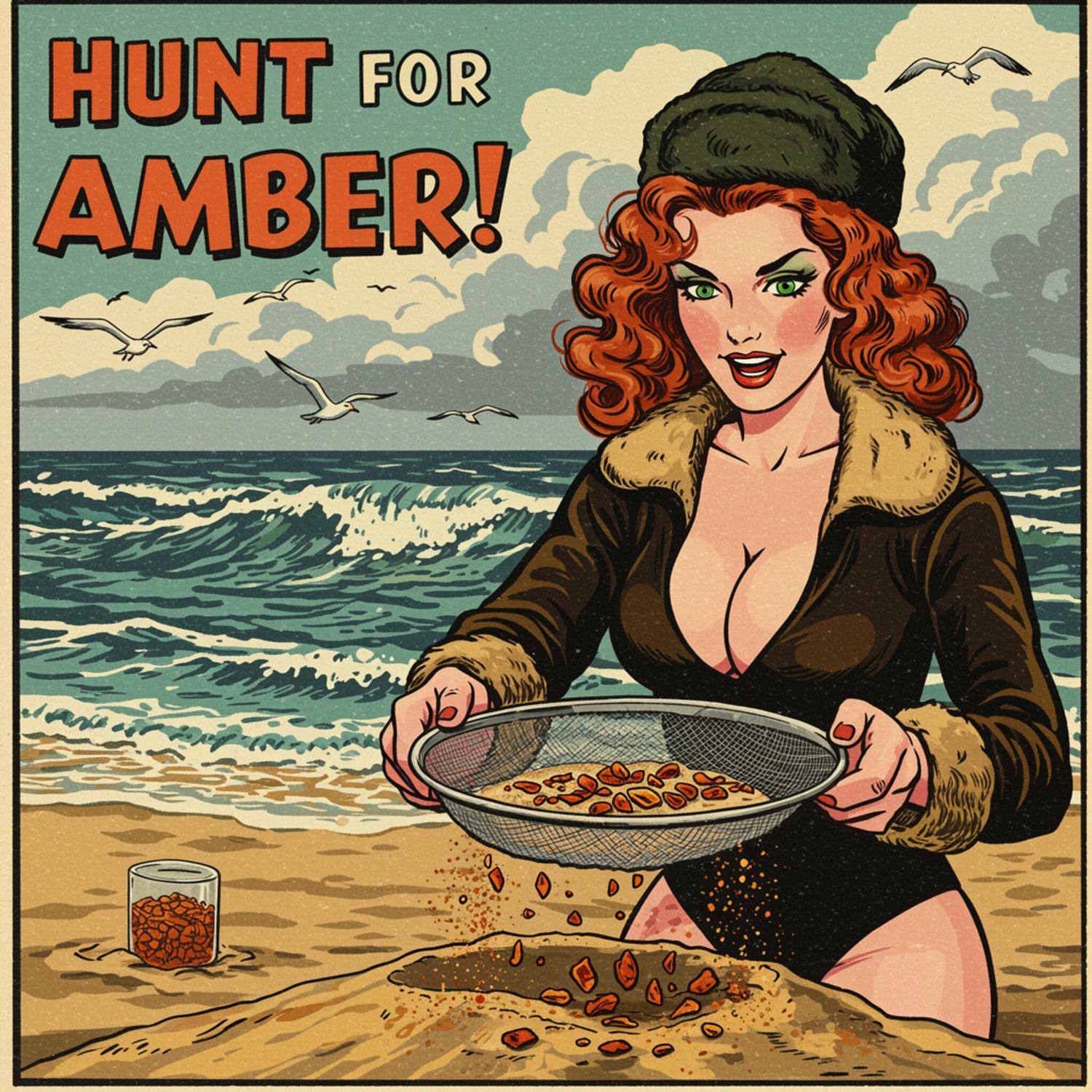 Kobieta prezentuje: of a person on a Baltic Sea beach, sifting through sand with a sieve after a storm. The person, dressed in a warm jacket and hat, is focused and holds the sieve with visible amber pieces. The background features the Baltic Sea with waves crashing and a cloudy sky, enhancing the post-storm atmosphere. Seagulls fly overhead, adding to the coastal scene. The text „Hunt for Amber!” in large, yellow, comic-style font is prominently displayed but does not overshadow the main subject. The composition ensures the person and the sieve are the central focus, with the natural elements providing a realistic and engaging backdrop. Background is artistic vision of dark matter.