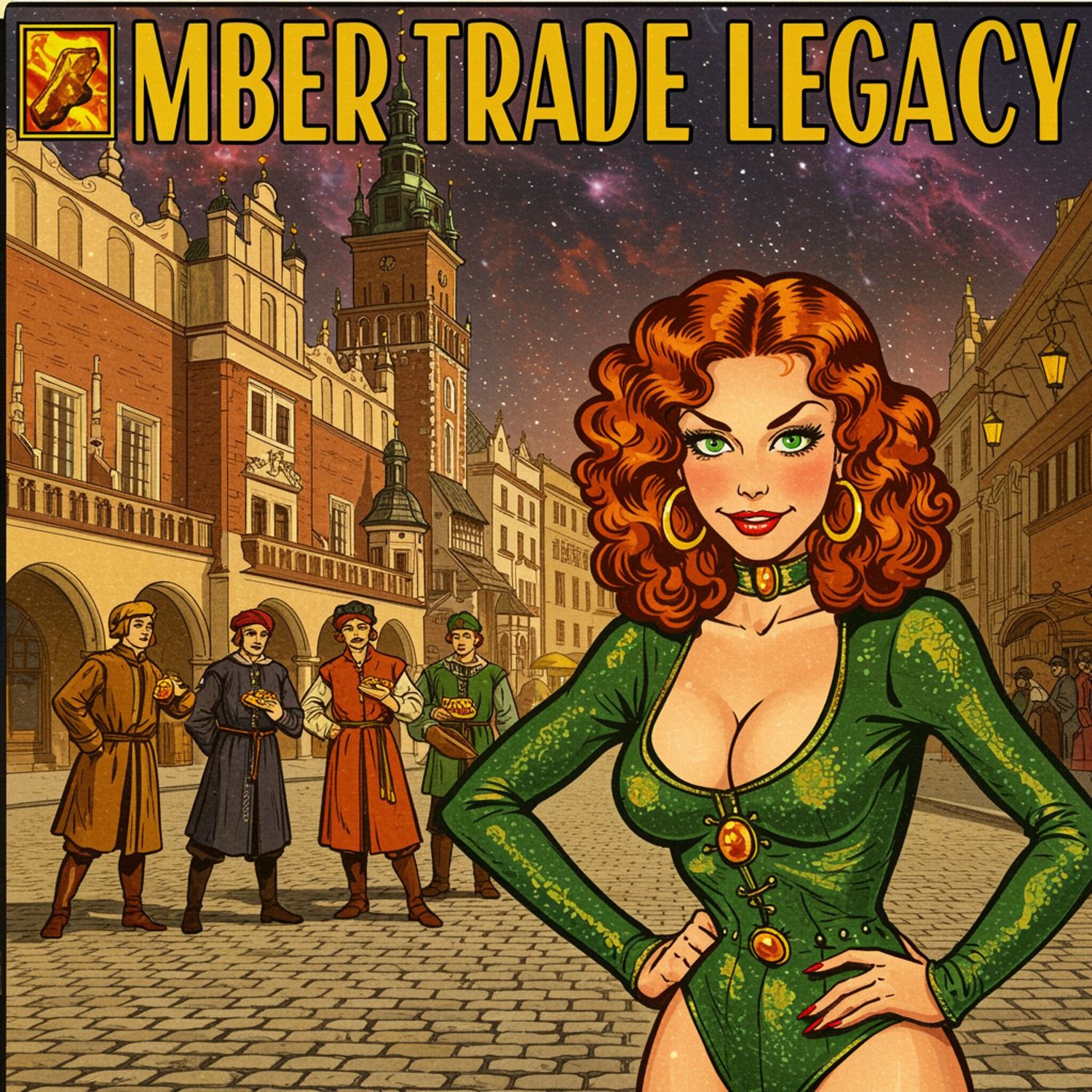Kobieta prezentuje: of the historic Sukiennice in Krakow during the day, with merchants dressed in a mix of medieval and modern attire trading golden amber jewels. The scene captures the architectural beauty of the Sukiennice, blending Gothic and Renaissance styles. The text „Amber Trade Legacy” in large yellow comic font is prominently displayed at the top of the image. The background features a slightly blurred cobblestone street, enhancing the focus on the main subjects without distractions. The overall composition is vibrant yet historically accurate, emphasizing the legacy of the amber trade along ancient routes. Background is artistic vision of dark matter.