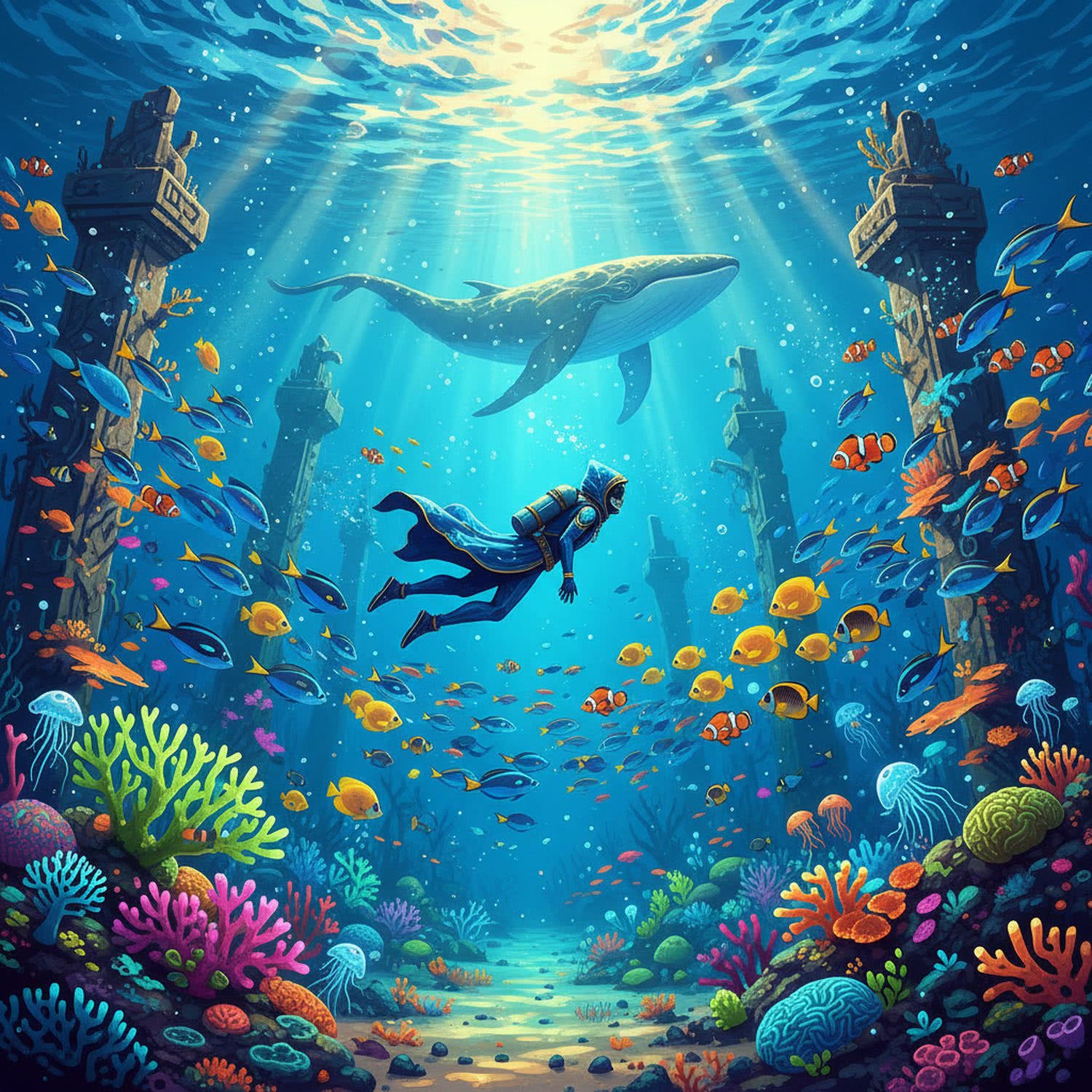 Artwork illustration: Artwork illustration: A serene underwater scene from the game Abzu, featuring a mysterious diver in a flowing suit gracefully swimming through vibrant turquoise ocean depths. Surrounding the diver are swirling schools of colorful tropical fish, glowing coral reefs, and ancient submerged ruins with intricate carvings partially illuminated by shafts of sunlight piercing the surface. In the background, a massive whale-like creature glides mysteriously, evoking wonder and harmony. Render in a hyper-realistic digital art style with dynamic lighting, bioluminescent accents, and a sense of peaceful exploration, high resolution, cinematic composition. Use a video game screenshot style, vivid color palette, pixel-art elements. Use a video game screenshot style, vivid color palette, pixel-art elements.