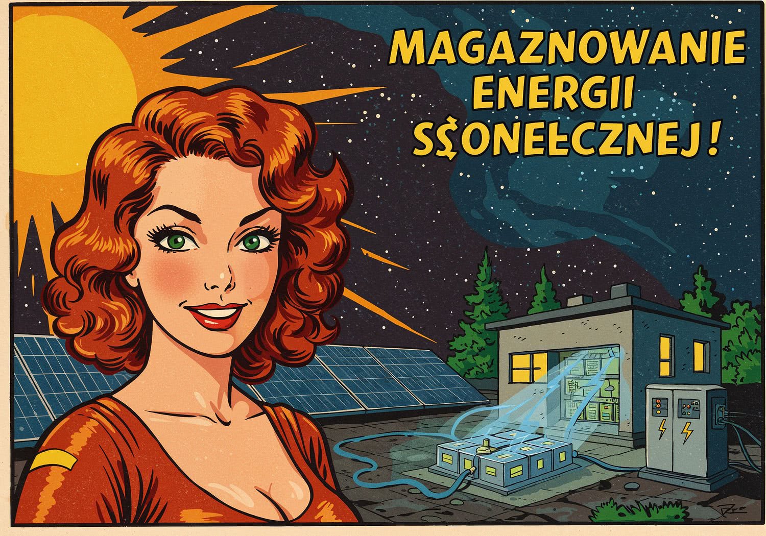 Kobieta prezentuje: A vibrant illustration of solar panels on a rooftop absorbing sunlight during the day, with energy flowing as glowing blue lines into a large modular battery bank beside a modern home, then powering the house lights at night under a starry sky, symbolizing energy storage and independence. The text reads in large yellow comic-book style font: 'Magazynowanie Energii Słonecznej!’ Background is artistic vision of dark matter.