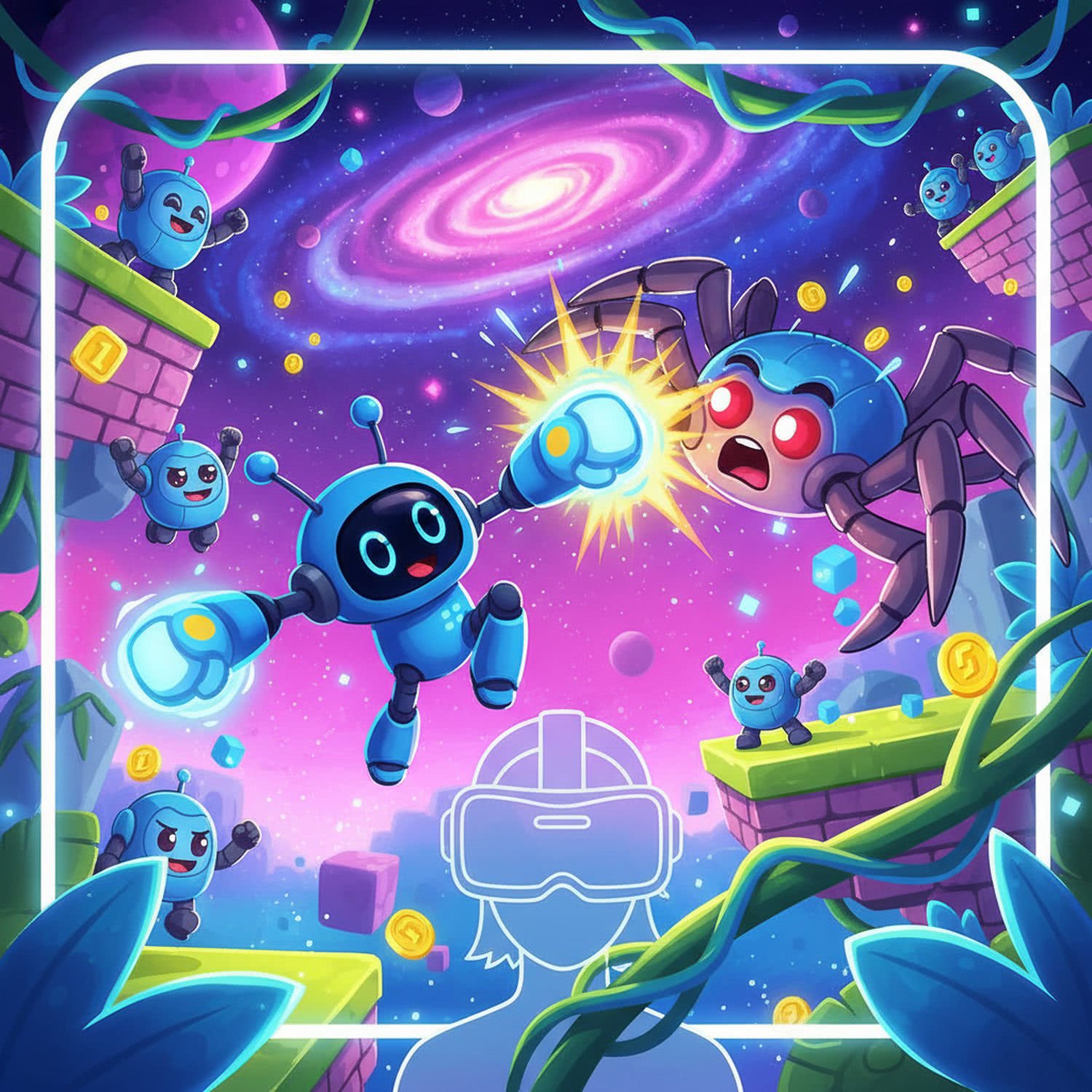Artwork illustration: Artwork illustration: A vibrant, dynamic illustration of the adorable Astro Bot character, a small blue robot with antennas on its head, in the midst of an exciting VR adventure on PlayStation 4. Astro Bot is leaping forward with glowing PS Move controllers as its extended hands, punching a giant comical enemy like a mechanical spider in a colorful cosmic jungle level filled with floating platforms, vines, rescued mini-bots cheering in the background, and swirling galaxies overhead. The scene captures immersive VR immersion with subtle headset outlines on the player silhouette in the foreground, in a cartoonish, high-energy style with bright neon colors, humorous expressions, and action lines for motion, evoking fun and rescue mission excitement. Use a video game screenshot style, vivid color palette, pixel-art elements. Use a video game screenshot style, vivid color palette, pixel-art elements.