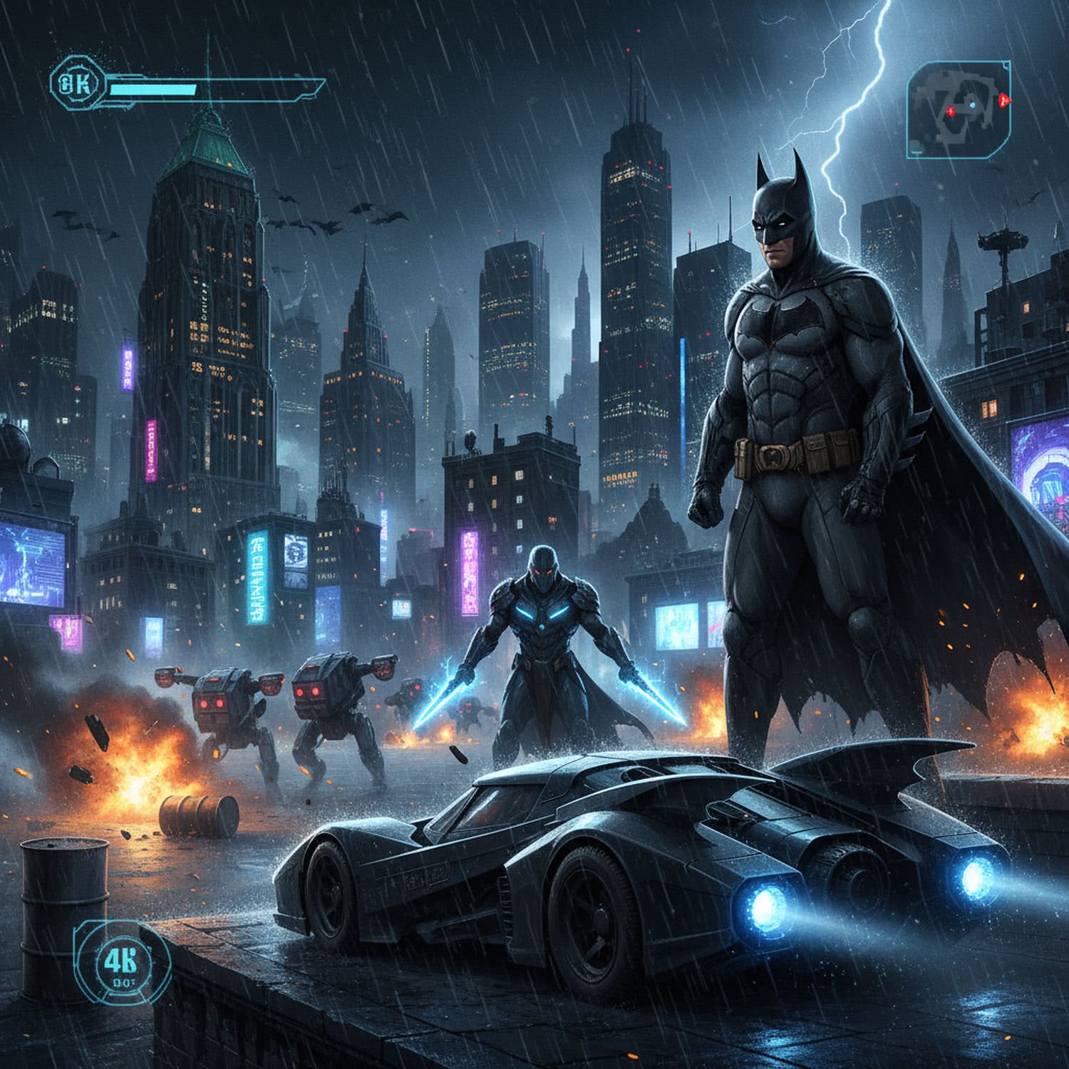 Artwork illustration: Artwork illustration: A dramatic cinematic illustration of Batman in his iconic black cape and cowl, standing on a rainy Gotham City rooftop at night, overlooking a sprawling neon-lit skyline with towering skyscrapers and foggy streets below. In the foreground, the sleek Batmobile is positioned aggressively, its headlights piercing the downpour, while in the distance, an army of menacing drones and a shadowy figure in advanced armor (the Arkham Knight) approaches amidst exploding barrels and chaotic urban warfare. Render in a gritty, realistic style inspired by Christopher Nolan’s Dark Knight films, with dynamic lighting from lightning strikes, volumetric rain effects, and a sense of epic tension and heroism. High detail, 4K resolution, dark color palette with blues, blacks, and glowing accents. Use a video game screenshot style, vivid color palette, pixel-art elements. Use a video game screenshot style, vivid color palette, pixel-art elements.