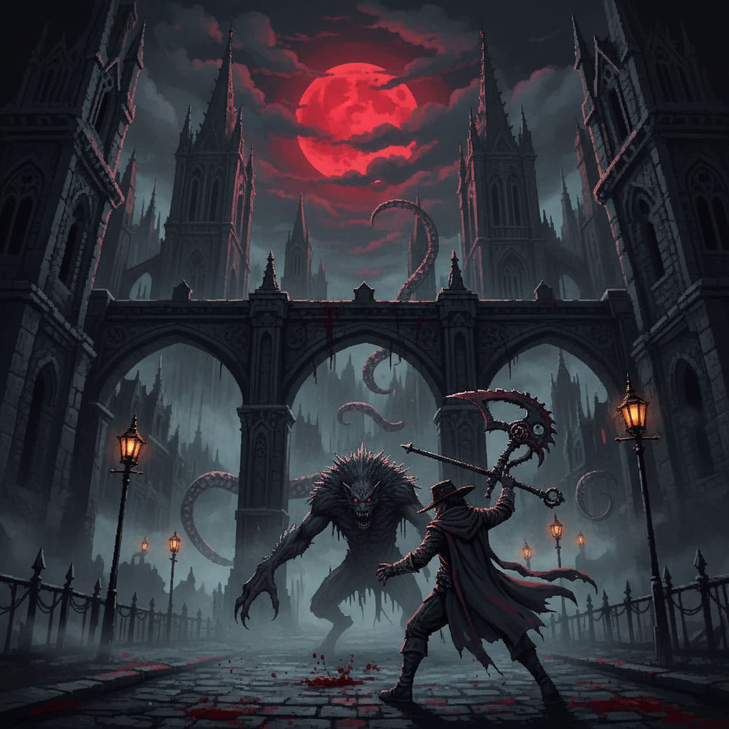 Artwork illustration: Artwork illustration: A dark, atmospheric illustration of the gothic city of Yharnam from Bloodborne, viewed from a foggy cobblestone street at night under a blood-red moon. In the foreground, a cloaked hunter in tattered Victorian attire wields a transforming trick weapon like a serrated axe, poised to strike a lurking werewolf-like beast emerging from the shadows of towering cathedrals and arched bridges. Subtle Lovecraftian tentacles coil in the misty background, with blood splatters on the ground and eerie lanterns casting dim orange glows. Render in a realistic, painterly style with high contrast, desaturated colors dominated by grays, blacks, and crimson accents, evoking horror and tension. Use a video game screenshot style, vivid color palette, pixel-art elements. Use a video game screenshot style, vivid color palette, pixel-art elements.