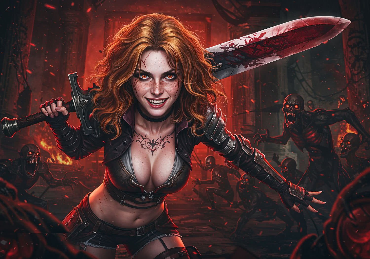 The girl presents: A dynamic anime-style illustration of a fierce female vampire character from Code Vein, with pale skin, glowing red eyes, and flowing dark hair adorned with blood code veins, wielding a massive jagged sword in a post-apocalyptic dungeon lit by eerie crimson glows. She is in mid-combat, slashing through a horde of glitchy, monstrous enemies that resemble crashing computer screens, overheating GPUs with flames, stuttering error pop-ups, and tangled RAM cables emerging from the shadows like revenants. In the background, faint outlines of a PC setup with Steam interface and Unreal Engine elements blend into the ruined architecture, symbolizing triumph over technical bugs. High contrast, dramatic action pose, detailed textures on armor and digital distortions, dark atmospheric tones with splashes of digital red and blue. Background is artistic vision of video game with some distortion and technical problems.