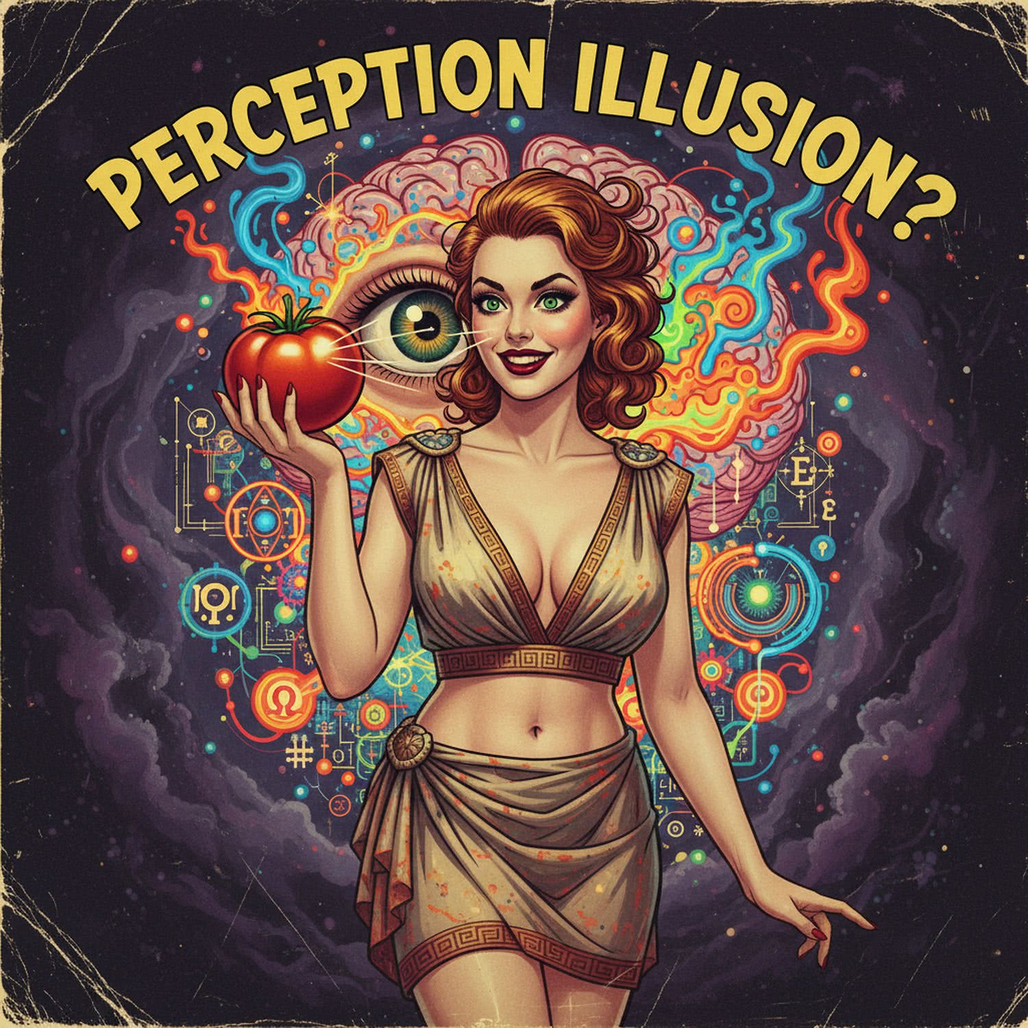 Kobieta prezentuje: A surreal human eye perceiving a ripe red tomato, with light waves entering as objective physics but transforming into vibrant, illusory qualia colors and emotions emerging from a brain-like construct in the background, blending philosophy and neuroscience elements like neural patterns and optical illusions. The text reads in large, yellow, comic-book style font: 'Perception Illusion?’ Background is artistic vision of dark matter.