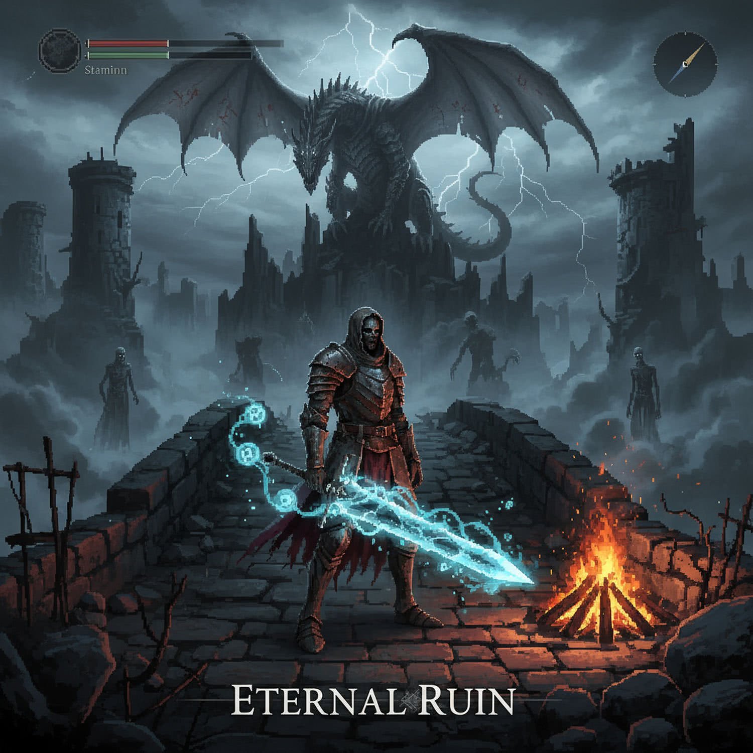 Artwork illustration: Artwork illustration: A lone undead knight in tattered armor stands poised for battle on a crumbling stone bridge in a foggy, ruined medieval fantasy world, gripping a massive sword with glowing blue souls trailing from its blade. In the background, a massive dragon perches on jagged cliffs under a stormy sky, while ethereal undead enemies lurk in the shadows of ancient towers. The scene is lit by a flickering bonfire nearby, casting warm orange glows against the dark, gritty atmosphere with high contrast, rusty ruins, and misty depths, in a realistic style inspired by Dark Souls artwork, emphasizing tension, peril, and epic isolation. Use a video game screenshot style, vivid color palette, pixel-art elements. Use a video game screenshot style, vivid color palette, pixel-art elements.