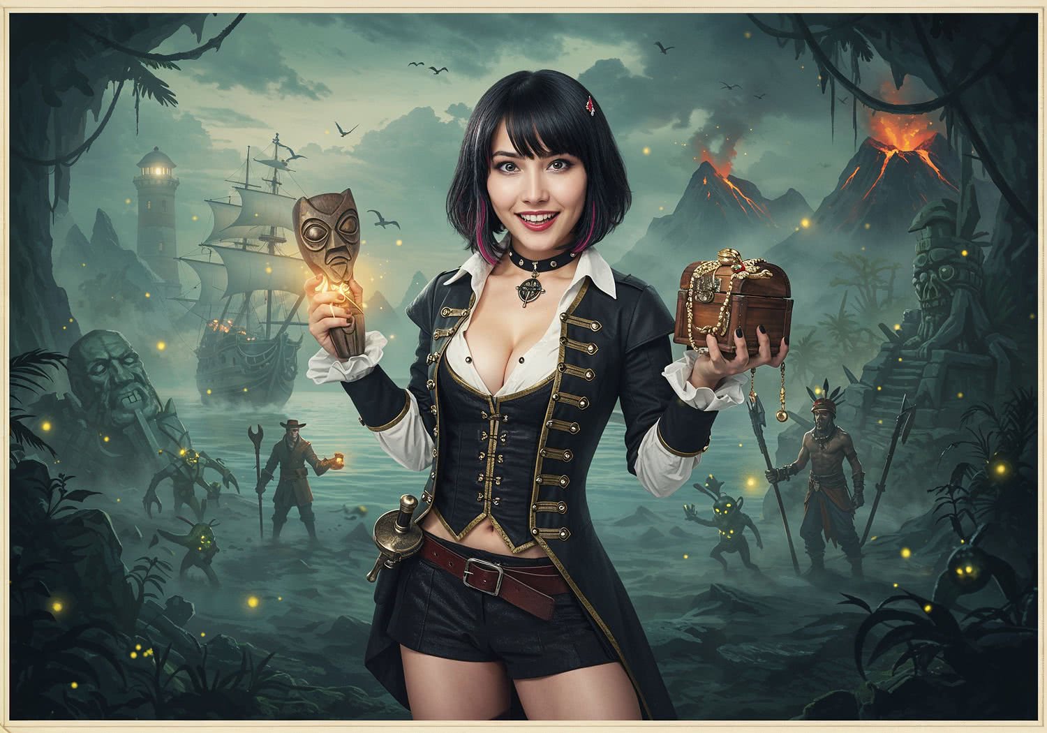 The girl presents: A highly detailed fantasy RPG illustration of a colonial explorer in 17th-century attire, standing triumphantly on the misty shores of the enchanted island Teer Fradee from GreedFall. The explorer holds a glowing ancient totem and a treasure chest overflowing with rare artifacts, elixirs, and a legendary sword, surrounded by lush tropical forests, ancient native ruins overgrown with vines, and distant volcanic plains with prowling mythical beasts like gardening creatures. In the background, a majestic ship sails into a foggy harbor near a lighthouse, with magical auras and fireflies illuminating hidden paths and secret caves. Companions—a rugged musketeer and a native shaman—stand nearby, evoking adventure, discovery, and moral intrigue in a vibrant, immersive open-world style with dramatic lighting and rich colors. Background is artistic vision of video game in-game screenshot.