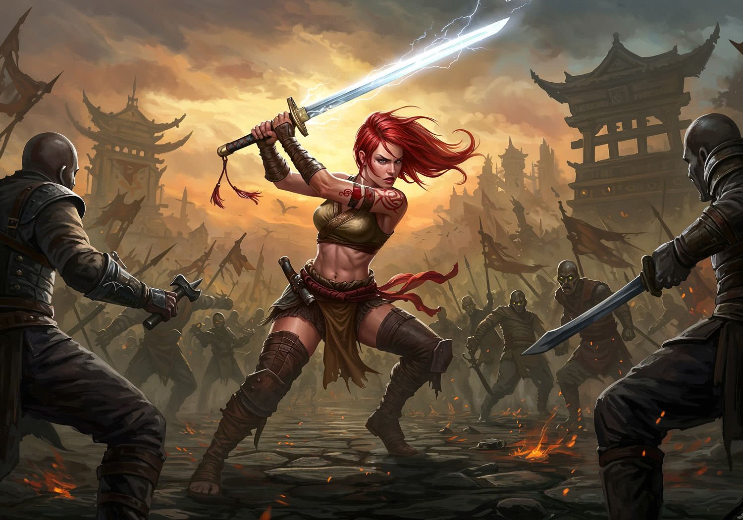 Artwork illustration: Artwork illustration: A fierce red-haired female warrior named Nariko, athletic and tattooed, dynamically wielding a glowing Heavenly Sword in mid-swing against shadowy enemies in a mythical feudal Japanese-inspired battlefield, dramatic lighting with motion blur for action, epic third-person perspective, high-fantasy style reminiscent of PS3-era games like God of War. Use a video game screenshot style, vivid color palette, pixel-art elements. Use a video game screenshot style, vivid color palette, pixel-art elements.