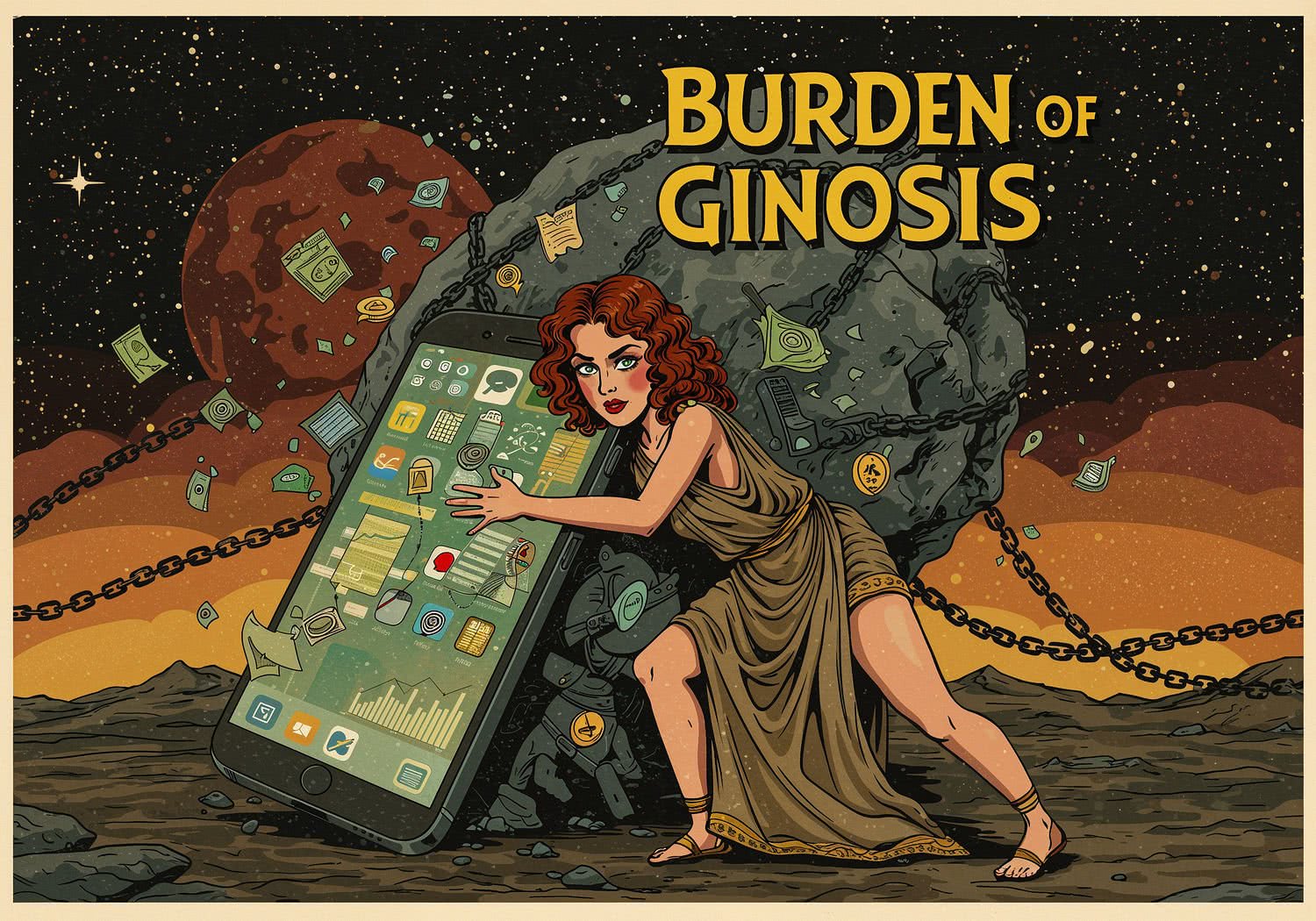 Kobieta prezentuje: A weary figure like Sisyphus pushing a massive boulder shaped like a glowing smartphone overflowing with data streams and icons, symbolizing the endless burden of information overload in a chaotic digital landscape, with chains of binary code wrapping around the figure. The text reads, in large yellow comic-book style font: 'Burden of Gnosis’ Background is artistic vision of dark matter.