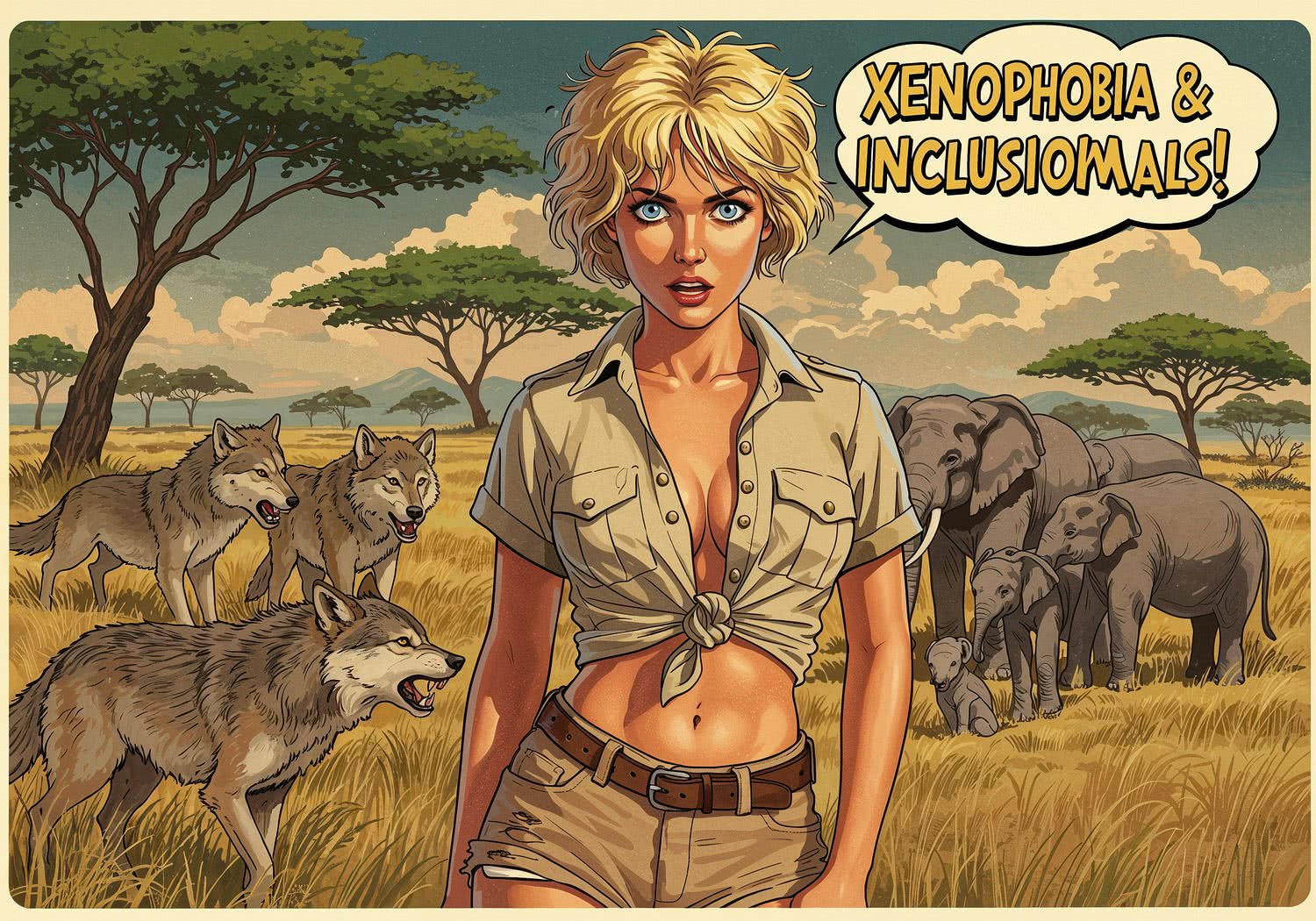 Kobieta prezentuje: A pack of wolves snarling aggressively at an intruding outsider wolf on one side, while on the other side a group of elephants gently welcoming and adopting a young calf from another herd, set in a wild savanna landscape under a dramatic sky. The text reads in large yellow comic book font: 'Xenophobia & Inclusion in Animals!’ Background is artistic vision of wild nature.