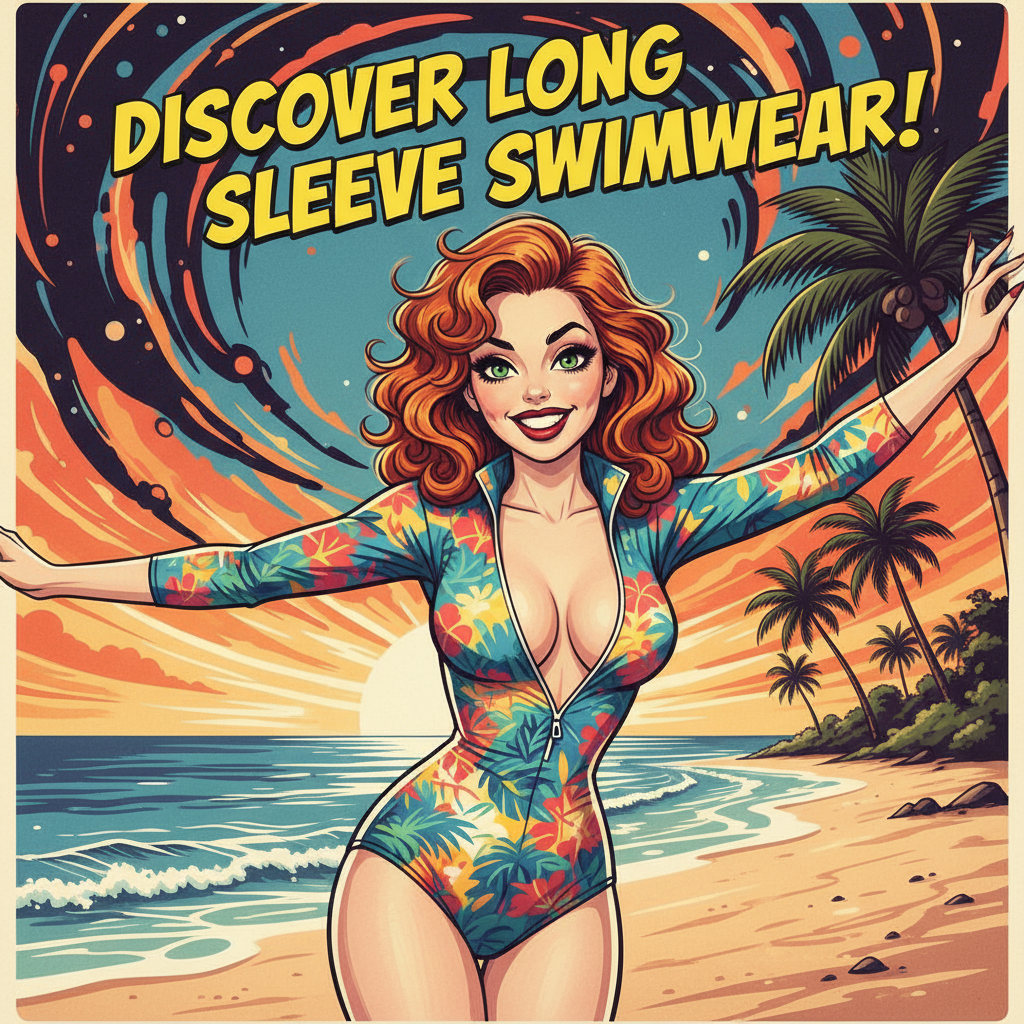 Kobieta prezentuje: of a confident woman in a vibrant, tropical-patterned long sleeve swimwear, standing on a sunny beach with ocean waves in the background. She has her arms outstretched, expressing joy and freedom, with her face clearly visible and smiling. The background features a clear blue sky and several palm trees, enhancing the tropical beach setting. The text „Discover Long Sleeve Swimwear!” is prominently displayed in large yellow comic book font style above her. The scene is lit by natural sunlight, creating a warm and inviting atmosphere without any distracting elements, ensuring the woman remains the focal point of the image. Background is artistic vision of dark matter.