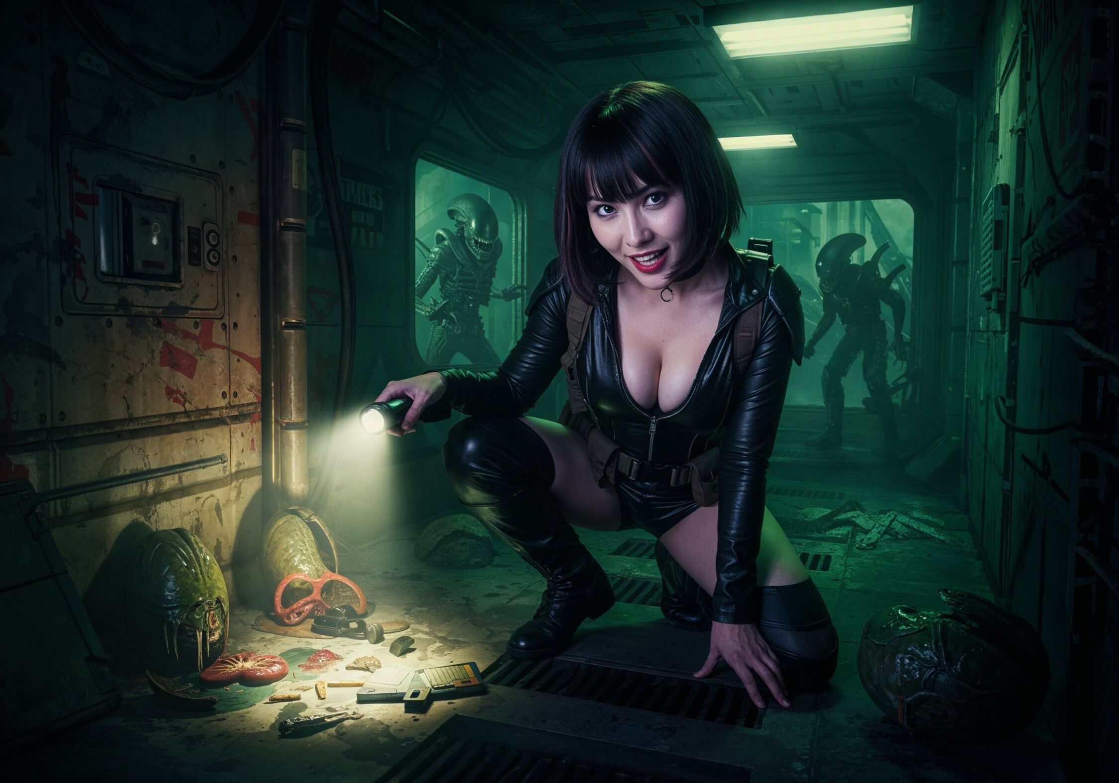 The girl presents: A highly detailed digital illustration in a dark, atmospheric sci-fi horror style inspired by the Alien franchise, featuring a Colonial Marine in tactical armor crouching in a dimly lit, abandoned spaceship corridor on LV-426, flashlight beam cutting through shadows to illuminate a glowing audio log on the floor amidst scattered UAC data pads and destroyed xenomorph eggs leaking acid. In the background, subtle silhouettes of lurking xenomorphs and facehuggers emerge from vents, with Hadley’s Hope colony structures visible through a cracked window, evoking tension, exploration, and hidden secrets in Aliens: Colonial Marines. Background is artistic vision of video game in-game screenshot.