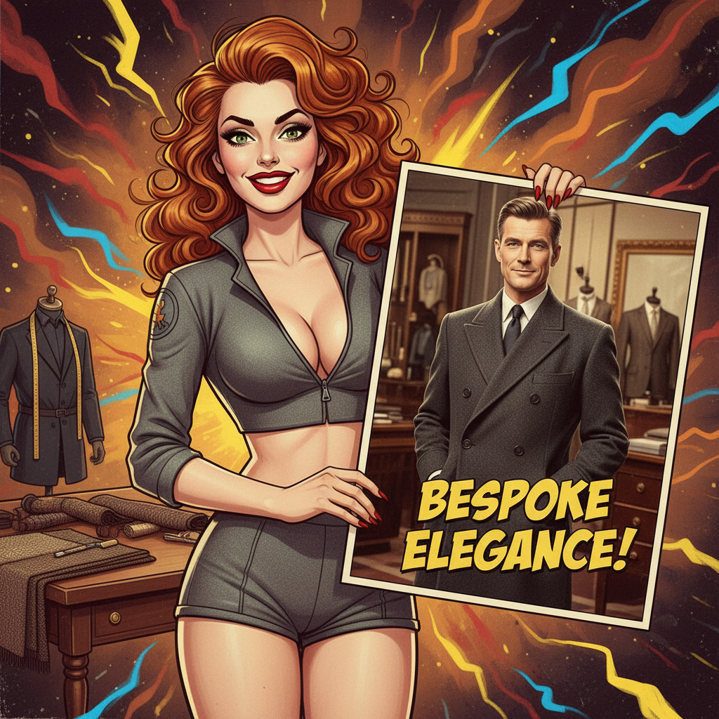 Kobieta prezentuje: of an elegant man in his mid-40s, wearing a perfectly tailored dark gray wool overcoat, standing confidently in a luxurious tailoring shop. The background features a slightly blurred tailor holding a measuring tape, with various luxurious fabrics like tweed and cashmere draped on a nearby table. The scene is lit with soft, natural light, possibly from a large window, creating a warm and sophisticated atmosphere. The text „Bespoke Elegance!” in large yellow comic-book style font is prominently displayed but does not distract from the main subject. The man has short, neatly styled hair and a subtle, confident smile. The overall composition focuses on the man’s face and upper body, emphasizing his elegant appearance and the bespoke nature of his attire. Background is artistic vision of dark matter.
