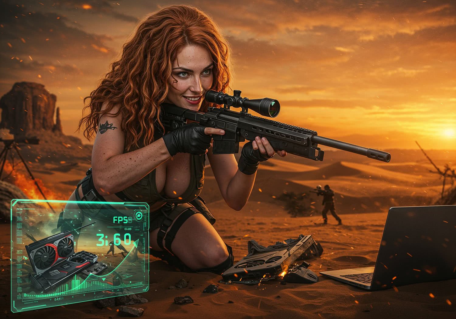 The girl presents: A highly detailed digital illustration of an elite sniper from Sniper Ghost Warrior Contracts 2, crouched on a sandy dune in the Middle Eastern desert at dusk, aiming through a high-powered rifle scope at distant enemies. In the foreground, integrate subtle PC optimization elements: a glowing FPS counter rising from 30 to 60 on a holographic display overlay, scattered old PC hardware like a GTX 960 graphics card and dusty CPU cooler transforming into sleek, performant components with green optimization sparks. The scene features mirage-like heat waves, tactical traps, and a rugged laptop nearby running the game, evoking tactical precision and hardware tweaks for smooth gameplay on older rigs. Style: realistic cinematic rendering with warm orange tones, high contrast, and dynamic composition. Background is artistic vision of video game with some distortion and technical problems.
