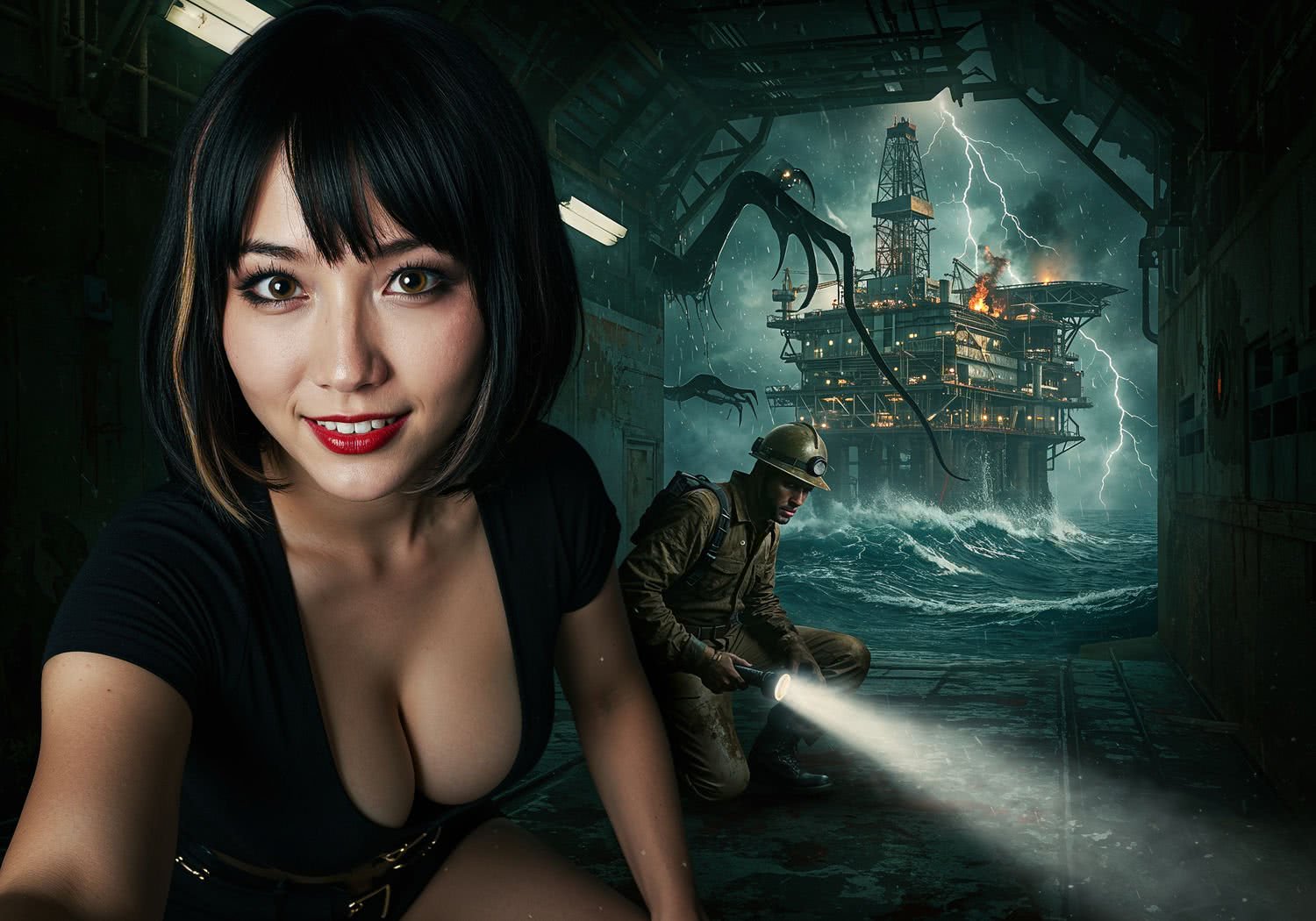 The girl presents: A dramatic survival horror scene from the game „Still Wakes the Deep,” set on a crumbling North Sea oil rig during a violent storm in 1975. In the foreground, the protagonist Caz McLeary, a rugged Scottish electrician in oil-stained work clothes and helmet, crouches stealthily in a dark, flooded corridor of the Beira D platform, flashlight beam cutting through the gloom to reveal blood-smeared walls and twisted metal. Behind him, a grotesque Lovecraftian monster with elongated, mutated limbs and siren-like tentacles emerges from the shadows, its form blending human and deep-sea horror inspired by Scottish folklore. In the background, the rig tilts perilously amid crashing waves, lightning illuminating flames from an explosion on the drill floor, with distant silhouettes of crew members fleeing or transforming. Convey claustrophobia, tension, and isolation with dim lighting, rain-slicked surfaces, and eerie blue-green tones from the stormy sea below. Highly detailed, cinematic style in the vein of dark fantasy horror art. Background is artistic vision of video game in-game screenshot.