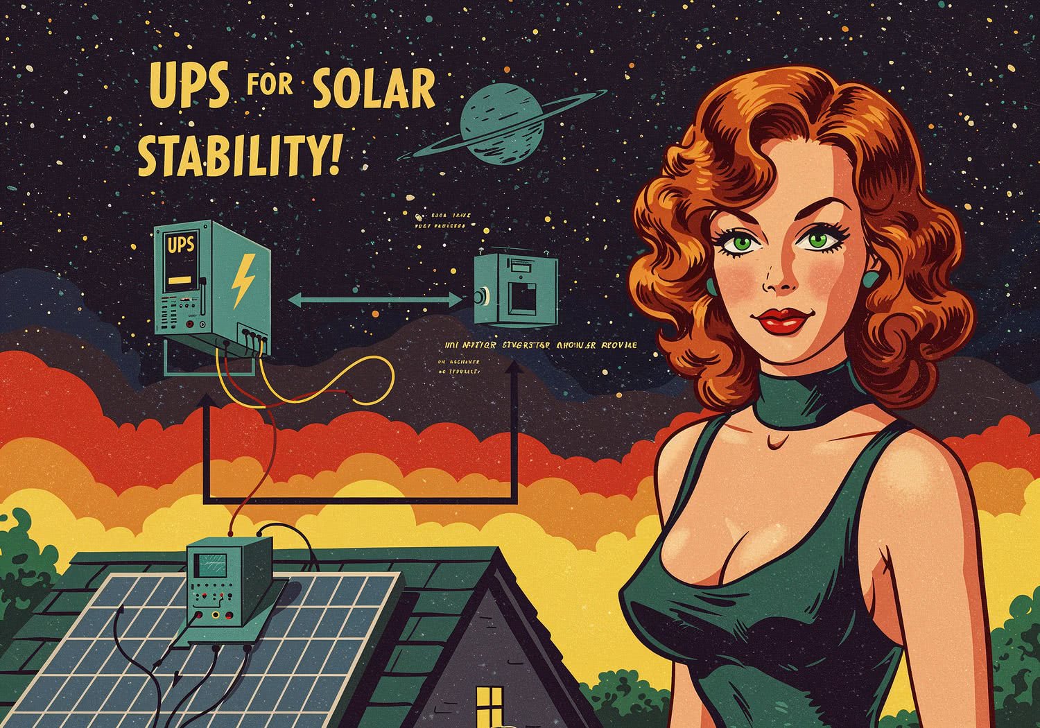 Kobieta prezentuje: Solar panels on a rooftop connected to a UPS device shielding an inverter from a power outage, with stable energy flowing to a home, illustrated in a clean technical diagram style. The text reads: 'UPS for Solar Stability!’ Background is artistic vision of dark matter.