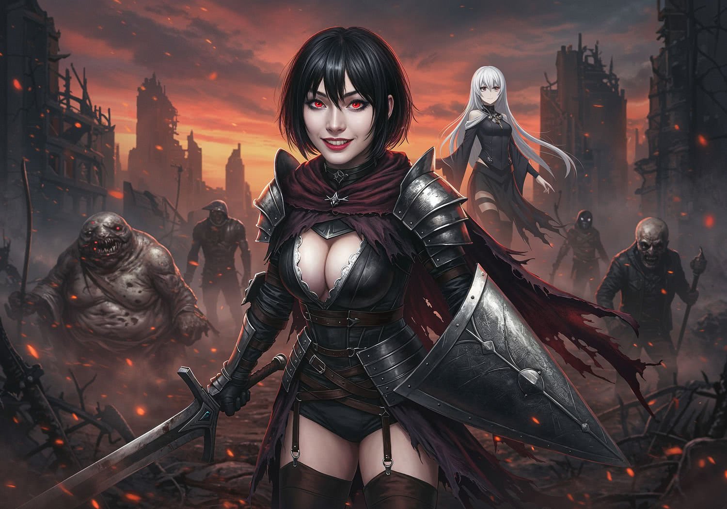 The girl presents: A dynamic anime-style illustration of a young Revenant warrior with pale skin and glowing red eyes, clad in a sleek Blood Veil armor with flowing cape-like extensions, wielding a massive sword and shield in a defensive stance. They stand in a crumbling post-apocalyptic cityscape at dusk, surrounded by foggy ruins, twisted metal debris, and eerie red haze. In the background, a loyal AI companion resembling a ethereal girl with white hair hovers supportively, while monstrous enemies like hulking bloated creatures and skeletal hounds lurk in the shadows. Dramatic red blood splatters and glowing ichor veins accent the scene, evoking a souls-like battle atmosphere with intense action lines and a sense of survival thirst. Dark, gothic tones with high contrast and anime shading. Background is artistic vision of video game in-game screenshot.
