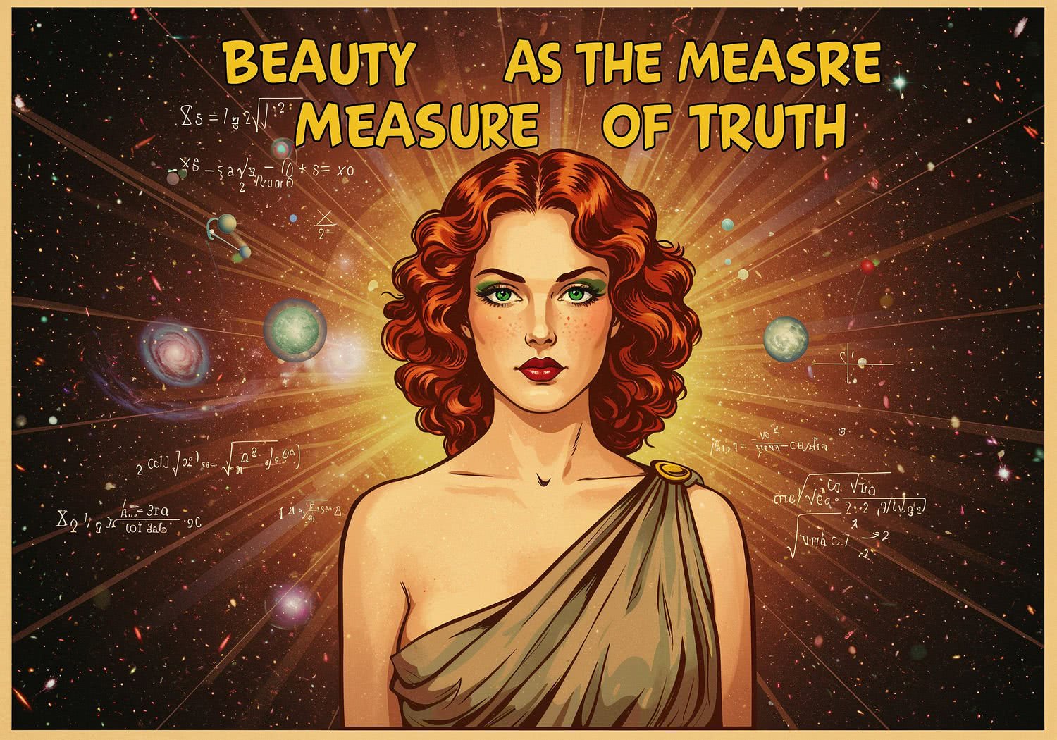 Kobieta prezentuje: A cosmic universe blending harmonious galaxies, symmetric mathematical equations like Einstein’s tensor and Dirac’s formula, and Platonic ideals of truth, goodness, and beauty emanating from a central glowing light, evoking metaphysical elegance and order. The text reads: 'Beauty as Measure of Truth’ in large yellow comic book font. Background is artistic vision of dark matter.
