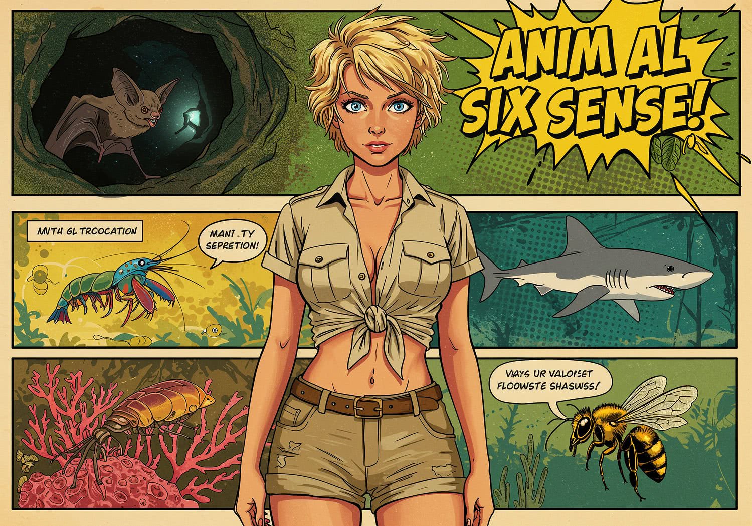 Kobieta prezentuje: Animals with extraordinary sixth senses: a bat emitting echolocation waves in a dark cave, a shark sensing electric fields around a hidden fish, a mantis shrimp viewing polarized light patterns on coral, and a bee detecting ultraviolet flower guides. The text reads: 'Animal Sixth Sense!’ in large yellow comic book font. Background is artistic vision of wild nature.