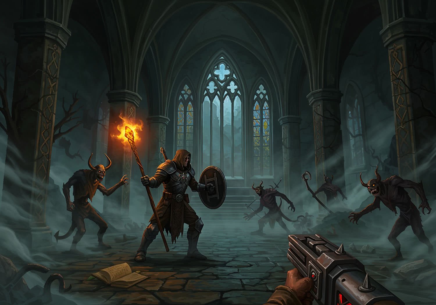 Artwork illustration: Artwork illustration: A dark fantasy retro-shooter scene inspired by 1990s games like Hexen: a lone armored wanderer with a glowing magical staff in one hand and a battle axe in the other, battling skeletal demons and shadowy beasts in a fog-shrouded ruined gothic cathedral. Low-poly pixelated graphics style with 256×256 textures, dim gray skies filtering through cracked stained-glass windows, scattered ancient tomes and alchemical puzzles on stone floors, eerie Gregorian chants implied through atmospheric mist, post-apocalyptic medieval horror vibe with Nordic runes on walls, fast-paced action frozen in a moment of fireball spell casting and melee clash, nostalgic 90s FPS aesthetic without modern realism. Use a video game screenshot style, vivid color palette, pixel-art elements. Use a video game screenshot style, vivid color palette, pixel-art elements.