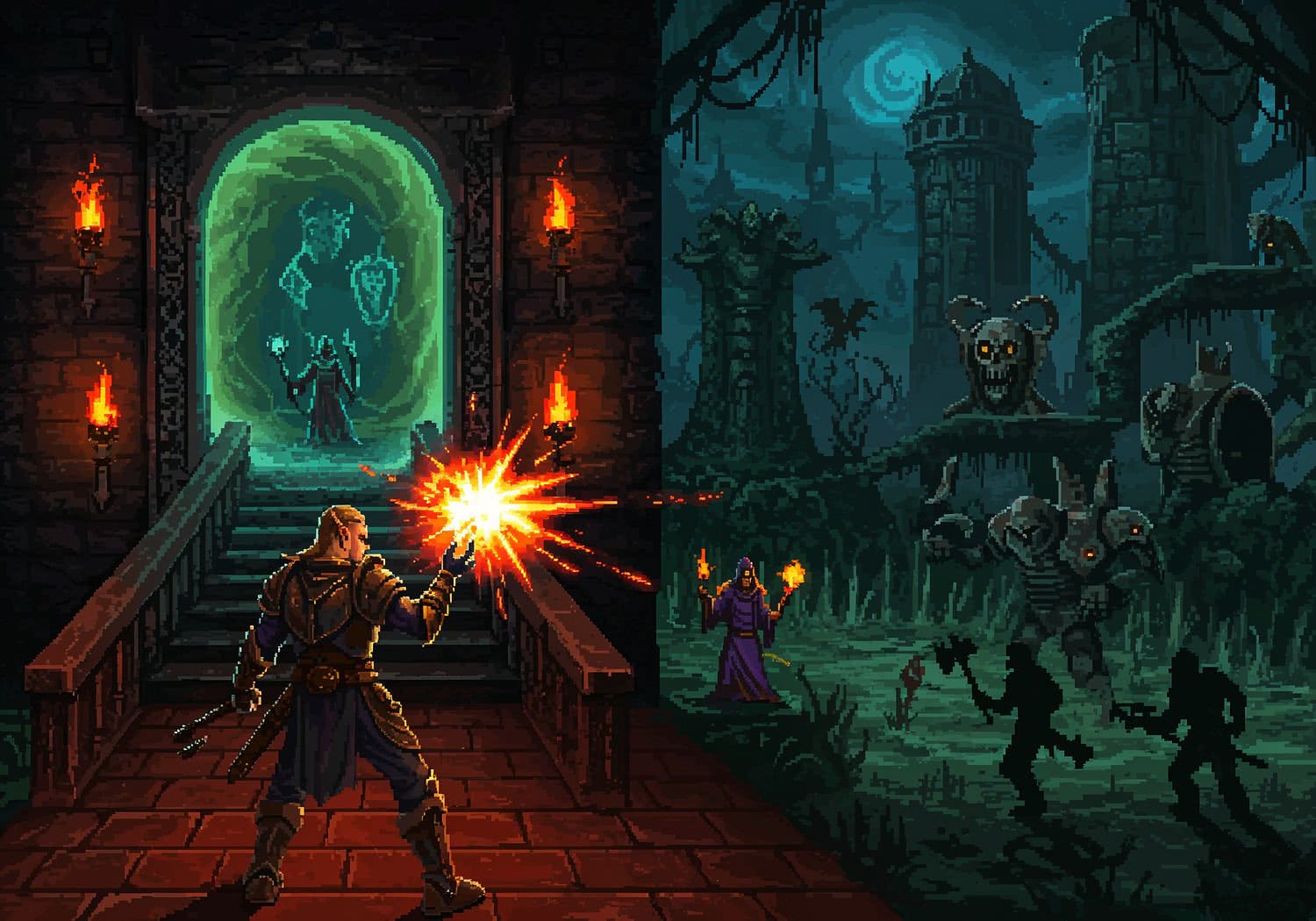 Artwork illustration: Artwork illustration: A dark fantasy FPS scene inspired by 1990s classics Heretic and Hexen: an elf warrior named Corvus stands in a gothic medieval castle corridor filled with flickering torchlight and shadowy crypts, casting a glowing magical spell from a phoenix feather rod that explodes in fiery bursts against approaching undead gargoyles and iron golems; in the background, a mystical portal hub opens to swampy realms and ancient towers, with fantasy elements like floating artifacts, spiked traps, and ethereal fog; three character silhouettes (fighter with hammer, cleric with lightning staff, mage teleporting) explore branching paths; atmospheric, retro pixel-art style with moody blue and red tones, evoking chaotic action and RPG exploration in a Doom-like engine. Use a video game screenshot style, vivid color palette, pixel-art elements. Use a video game screenshot style, vivid color palette, pixel-art elements.