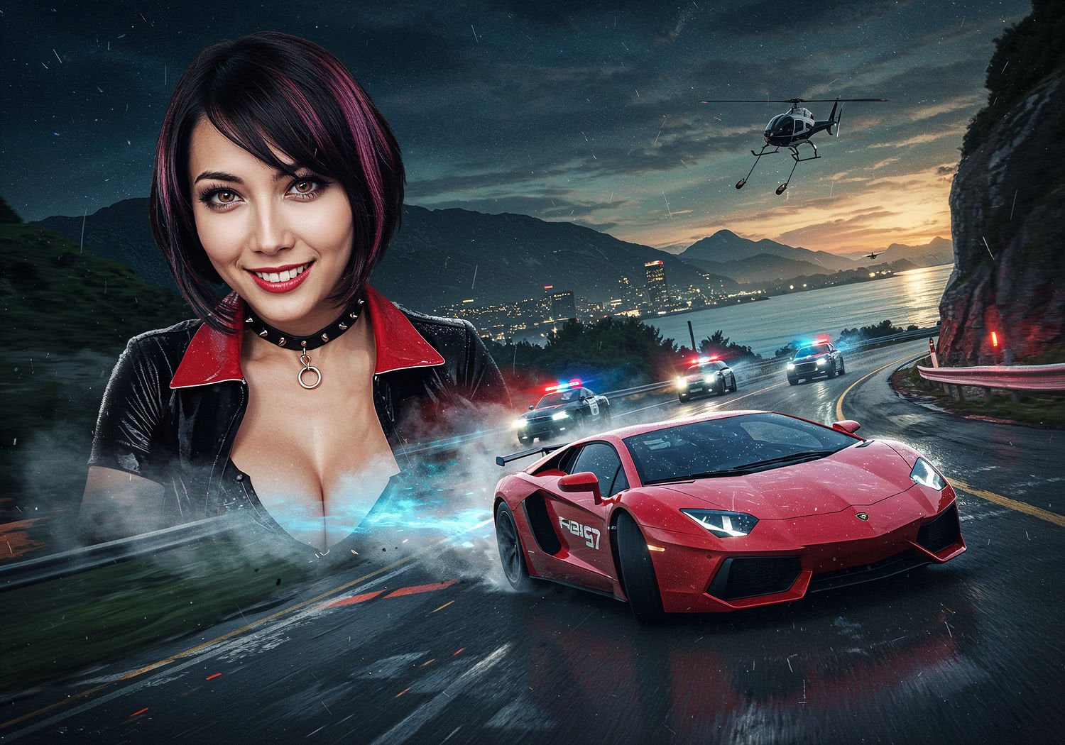 The girl presents: A dynamic, high-octane illustration of a high-speed police chase in Need for Speed Hot Pursuit Remastered, set on a winding coastal highway at dusk in Seacrest County. In the foreground, a sleek red Lamborghini supercar drifts sharply around a curve with glowing blue nitro boost trails, evading spike strips on the road. Behind it, multiple police interceptors with flashing lights and sirens pursue aggressively, one ramming from the side while a helicopter hovers above dropping roadblocks. Dramatic rain-slicked roads, distant mountains, and city lights in the background emphasize adrenaline and precision driving on PC. Vibrant, realistic graphics with motion blur and particle effects for speed. Background is artistic vision of video game in-game screenshot.