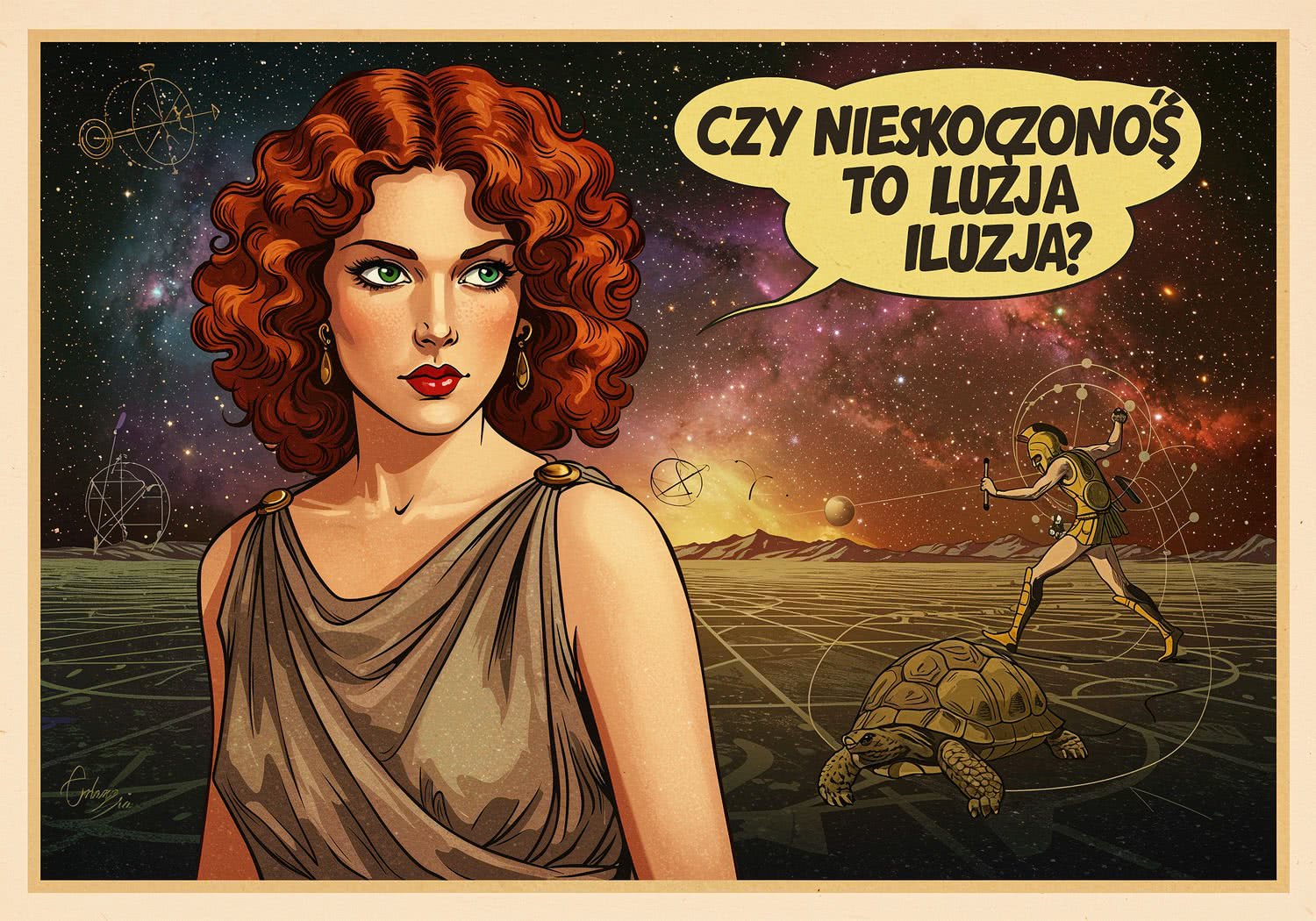Kobieta prezentuje: Achilles the warrior endlessly chasing a tortoise across an infinite fractal landscape, with swirling mathematical infinity symbols, Zeno’s paradoxes visualized as looping arrows and divided paths, and distant galaxies fading into eternity. The text reads in large yellow comic book font: 'Czy nieskończoność to iluzja?’ Background is artistic vision of dark matter.