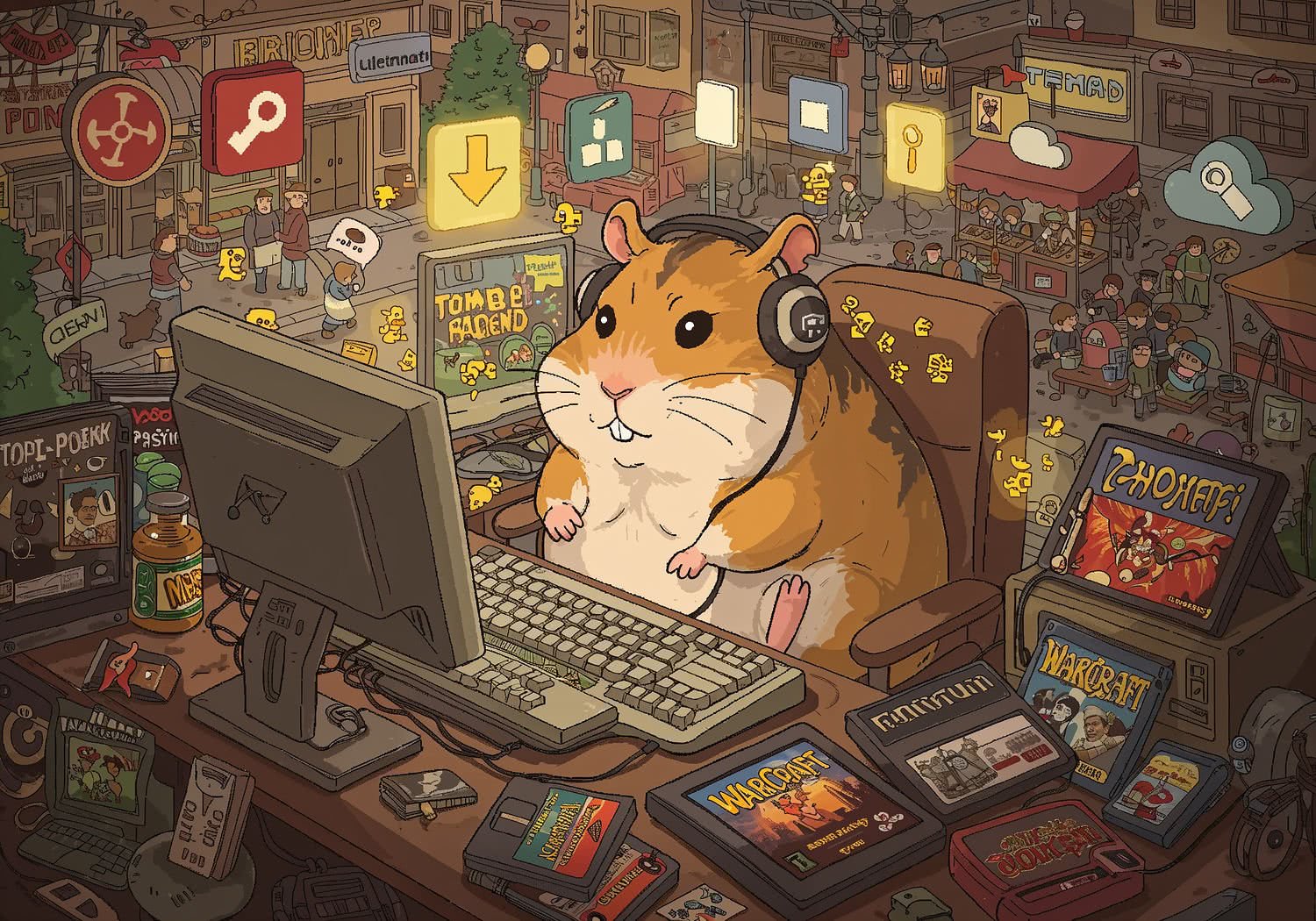 Artwork illustration: Artwork illustration: A whimsical illustration in a retro pixel art style depicting a chubby hamster (chomik) as the central figure, sitting inside a cluttered computer desk setup from the 2000s, hoarding stacks of floppy disks, CD-ROMs, and game cartridges labeled with classics like „Tomb Raider: Legend,” „Lemmings,” and „Warcraft.” The hamster wears tiny headphones and types on an old keyboard, with glowing download arrows and file-sharing links floating around it like treasures. In the background, a nostalgic Polish urban scene with 90s bazaars, schoolyards, and forum chat bubbles in Polish, transitioning to modern cloud icons and legal platforms like Steam and GOG.com, symbolizing the evolution from piracy to digital distribution. Warm, nostalgic colors with a touch of humorous rebellion, evoking community and cultural survival. Use a video game screenshot style, vivid color palette, pixel-art elements. Use a video game screenshot style, vivid color palette, pixel-art elements.