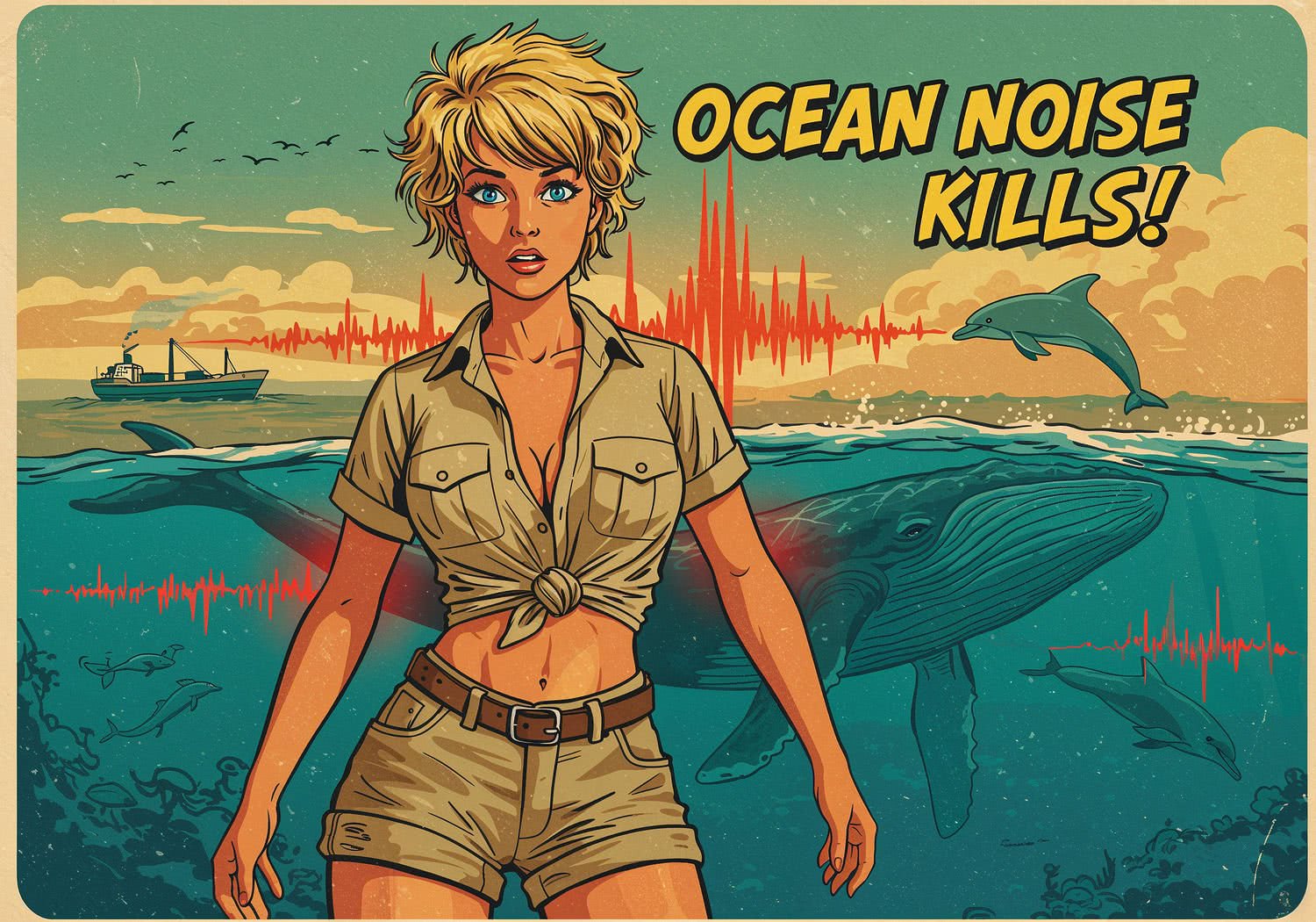 Kobieta prezentuje: A majestic humpback whale swimming in the deep blue ocean, emitting echolocation clicks visualized as glowing sound waves that are being distorted and overwhelmed by chaotic red noise waves from a distant cargo ship and military sonar pulses, with confused dolphins nearby struggling to communicate. The text reads in large yellow comic book font: 'Ocean Noise Kills!’ Background is artistic vision of wild nature.