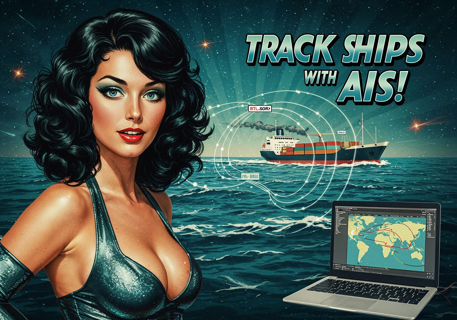 Kobieta prezentuje: A cargo ship sailing on ocean waves with radiating AIS radio signals connecting to a USB RTL-SDR receiver on a laptop shore setup, displaying real-time ship tracks on a digital nautical map overlay. The text reads: 'Track Ships with AIS!’ in large, shiny font stylized like radio waves. ;;Background is artistic vision of world full of radiofrequency ane electromagnetical waves.